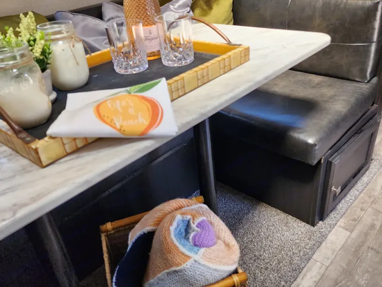 Outside there is a large awning with LED lighting, outdoor kitchen with small fridge and cook top, out door shower, rack at the back for bikes and coolers and a back up camera. The LED lighting in the awning gives your evenings a romantic feel.Kitchen has all the amenities with stainless steel finish we also supply all your cookware, dishes, utensils, toaster, kettle, Tassimo for those coffee needs and so much more. There is lots of cupboard space in the kitchen including a pantry for all your food goodies. The kids will love this camper they can enjoy as a family the flatscreen T.V cuddle up on an evening with a bowl of popcorn, or play games at the large table at the U shaped dinette.The bedroom comes with two wardrobes and under bed storage. There is also storage under the bunkbeds and under the dinette, this trailer is not lacking for places to store your holiday needs. Outside is a full width length storage unit for chairs, water toys etc.Sorry this is a NO PET and NO Smoking Trailer. We DO NOT rent out for events.This trailer will delight with its warm cosy décor and amenities that have all the bases covered.
