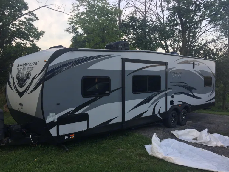 White, grey and blue exterior. Weighs 7,400 lbs. 3 motor home queens plus reclining couch (sleeps 6-8). Living room slide out.