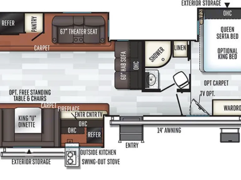 The side of the trailer is fully equipped with two electronic awnings, one on the slide-out and the other on the main wall of the trailer. Also, there is an outdoor mini kitchen containing a medium sized refrigerator, storage, small trash can and two burner pull out stove.Miscellaneous Items