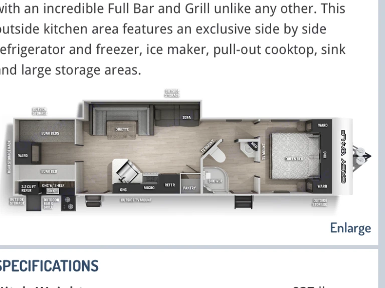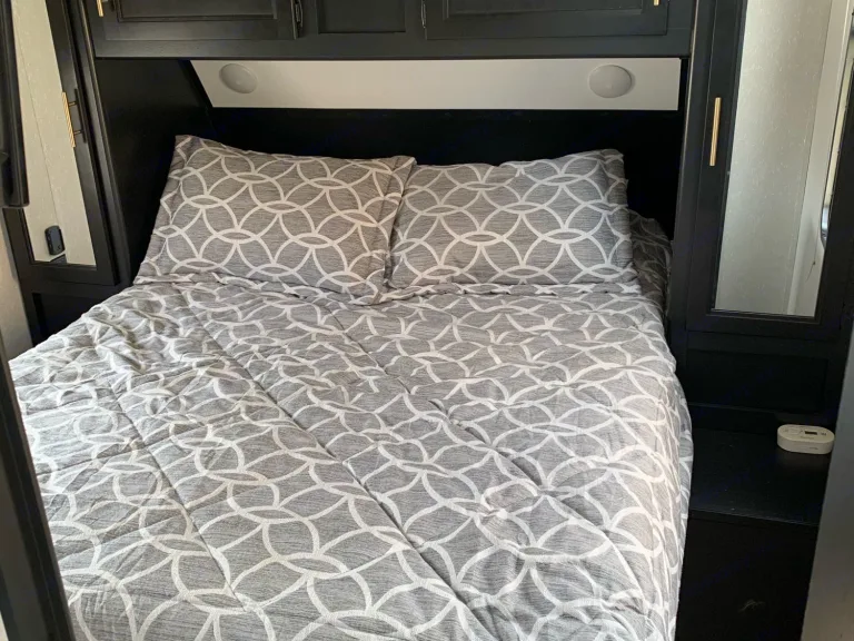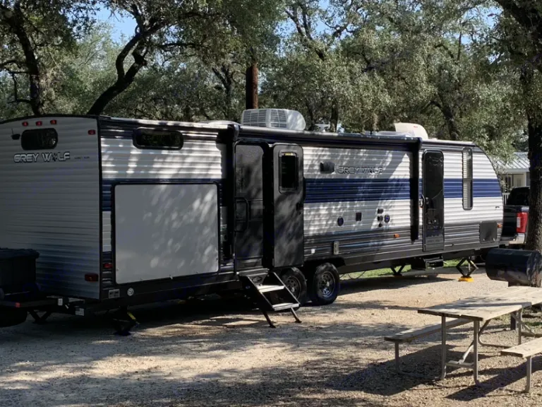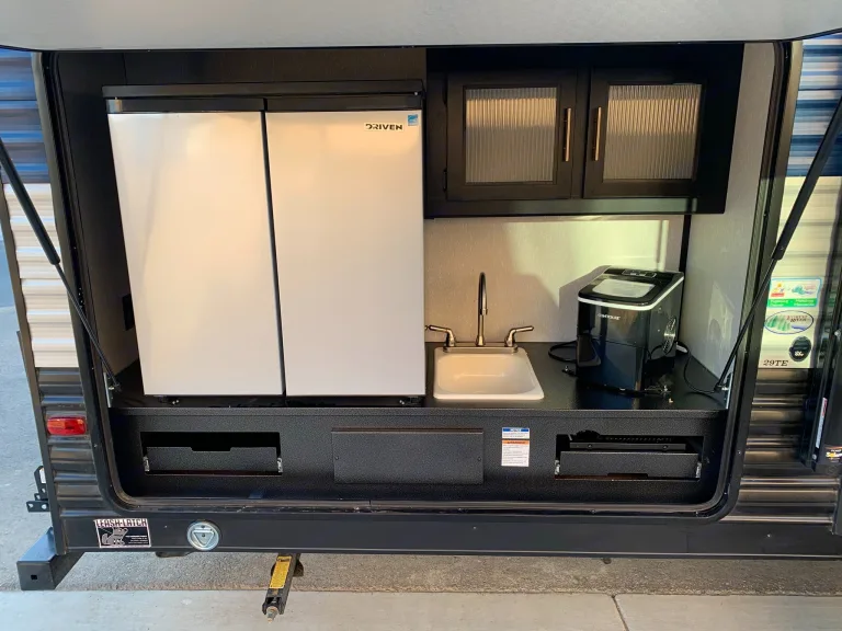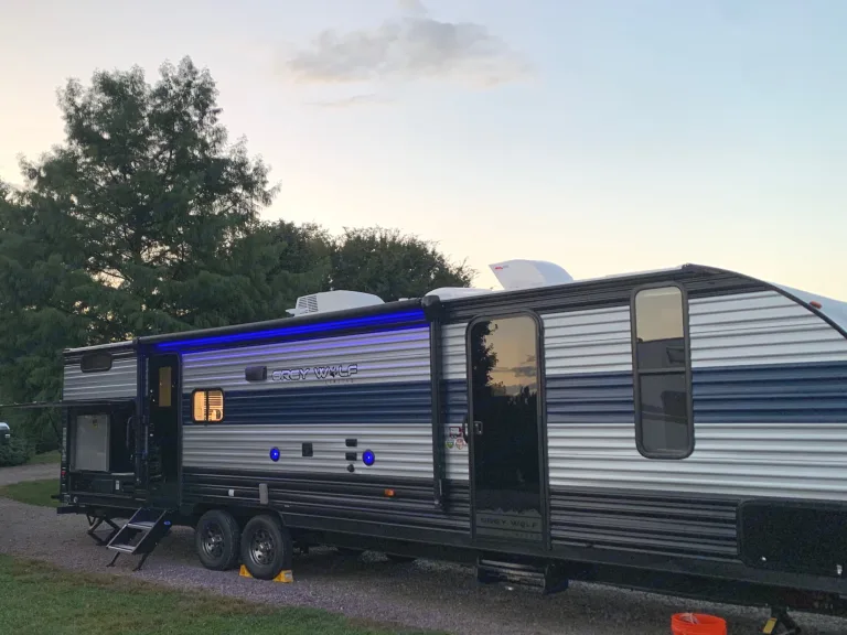 Comfortable, clean bunkhouse travel trailer. This travel trailer features a great outdoor kitchen, power awning and indoor outdoor sound system on the exterior. The interior features a main bedroom with a separate room 3 bed bunkhouse, 2 televisions, U-shaped dinette and jackknife sofa. This is an incredibly nice travel trailer to have an amazing camping trip! What's includedTravel trailer comes with 5 camping chairs, 5 towels, one full propane tanks, basic kitchen utensils, a toaster, a standard coffee pot, clean sheets and pillows for the beds (no blankets) and other misc. supplies to make your camping trip amazing!Other things to noteNo pets
