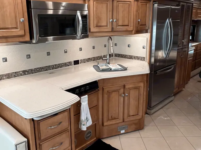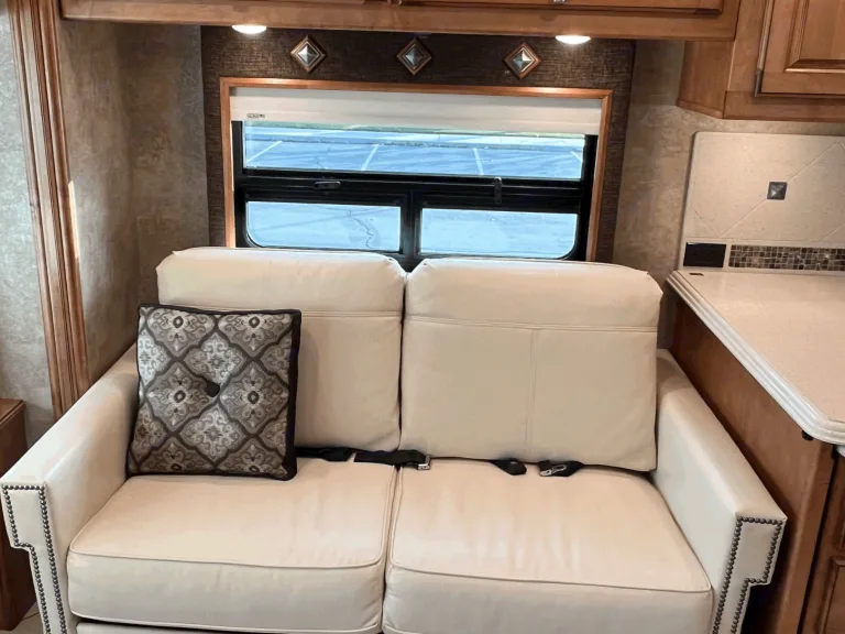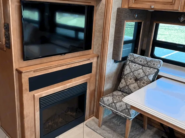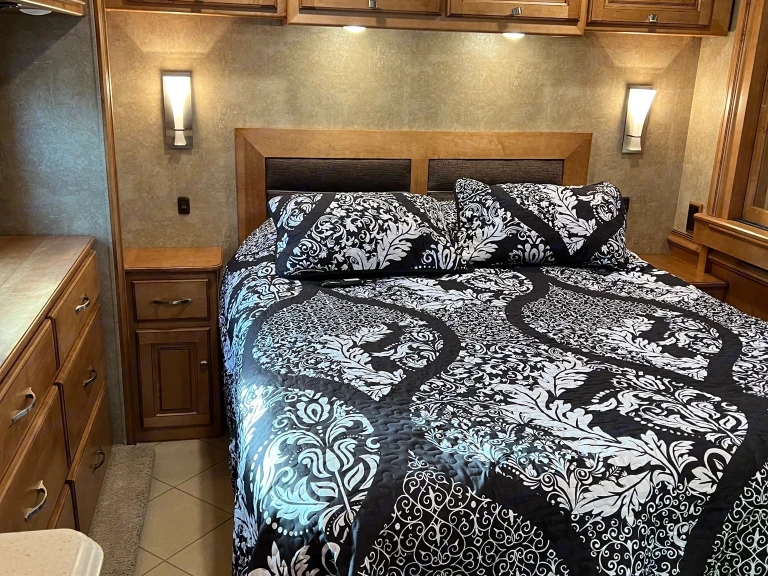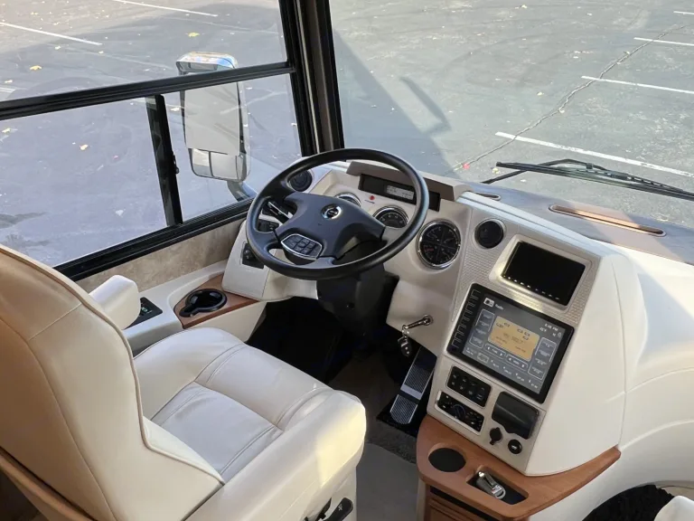 The soft, Ultraleather seats make even the longest rides comfortable. The infotainment center features an RV GPS has it all: touch screen color monitor with split screen function, safe and easy routing, CD/DVD player, compass and outside temperature. Rear and side camera's provide additional visibility while driving.Amenities include 4 televisions: 3 inside and 1 outside, cozy fireplace, Corian countertops, hardwood cabinetry throughout, Ultraleather soft furniture, and much more.The kitchen features a microwave/convection oven, stainless steel double door residential refrigerator with an ice and water dispenser, and extensive storage. This kitchen has the space you need to prepare meals while on the go. As an added bonus: the kitchen comes fully stocked with all the utensils, dishes and cookware needed.In the bedroom, a good night’s sleep is one adjustment away with the Ideal Rest digital comfort control Queen mattress bed with gel foam topper.There is a sizable bathroom with spacious shower and skylight. Plus, a bonus sink in the bedroom for added convenience. Large dresser drawers and a full-length closet offers abundant bedroom storage, with space for plenty of clothes and other necessities.