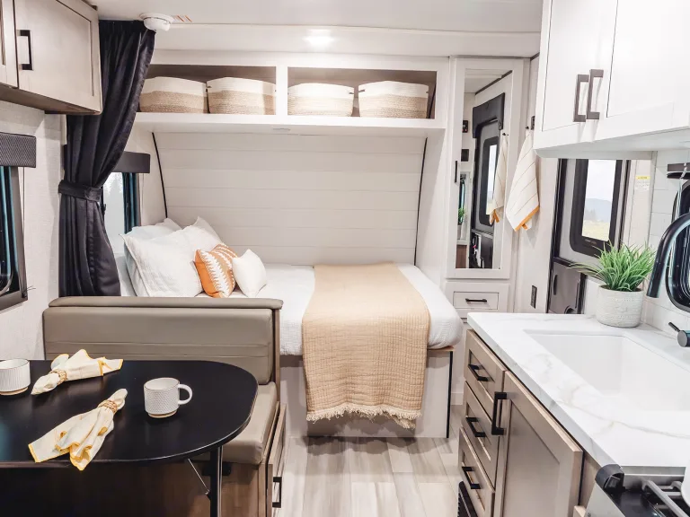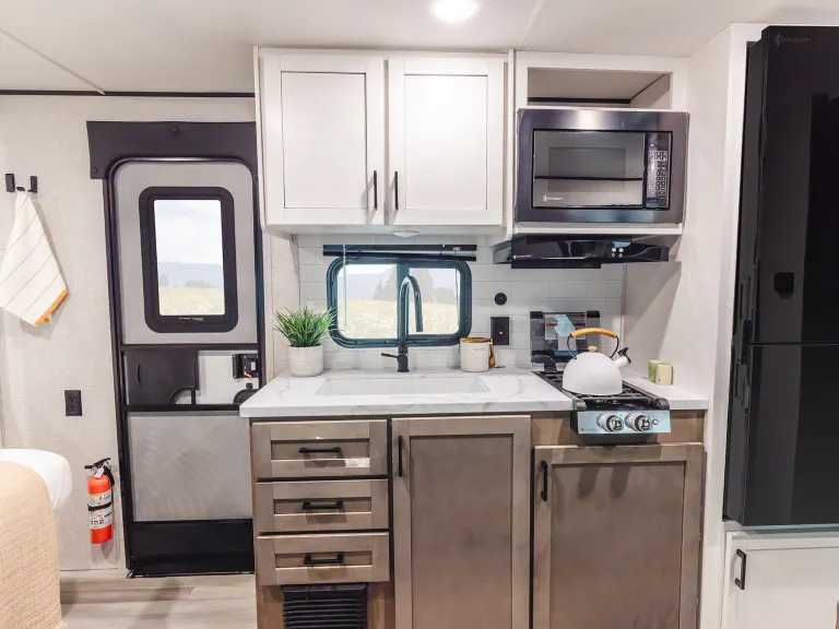 For a smaller camper, this one has tons of smart storage. There’s space for all your gear with storage under and above the dinette, decorative storage baskets, coat hooks, and even a spot for your trash can so it’s not in the way.A real kitchen setup