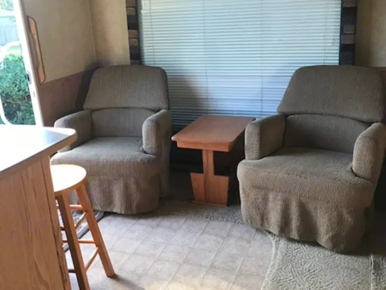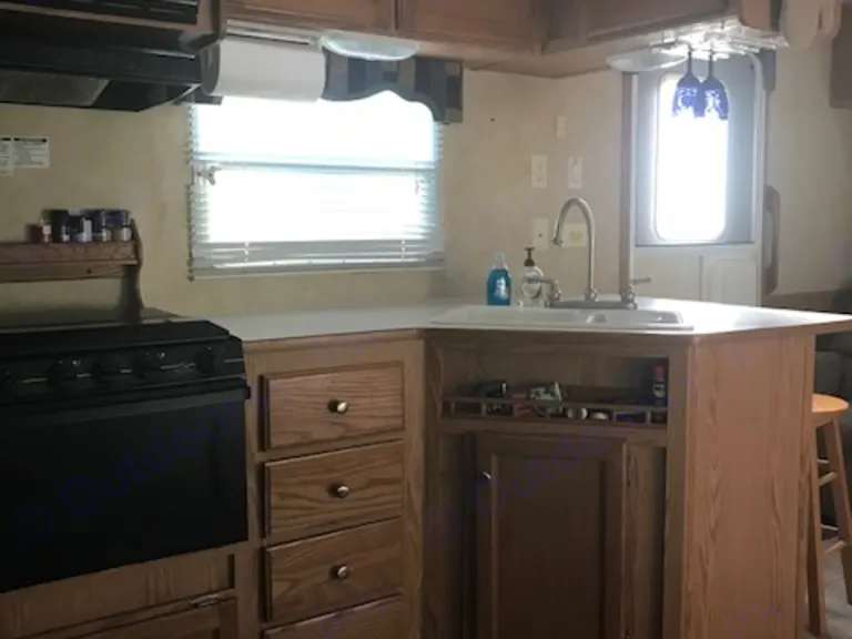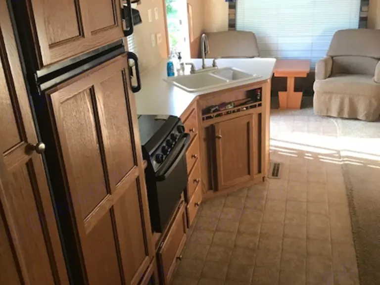 A real comfortable and cute rig. Kitchen is easy to work in. Living room that has a slide is roomy, Master bedroom is private. Unit will sleep up to 5 to 6 people. Large shower and toilet area. You will really enjoy camping in this 5th wheel.