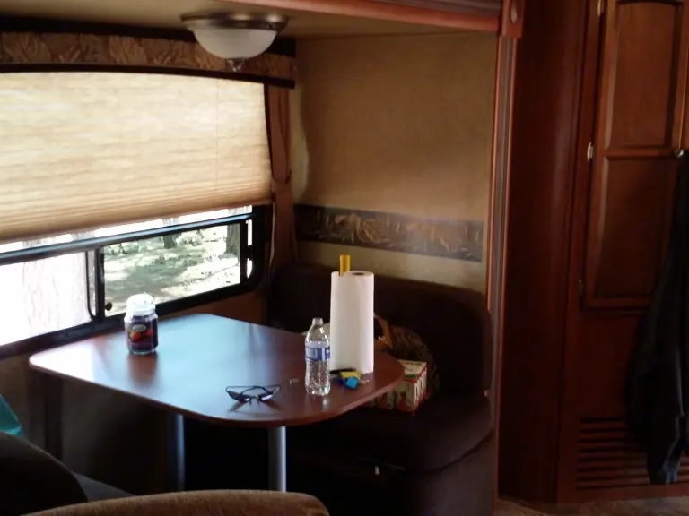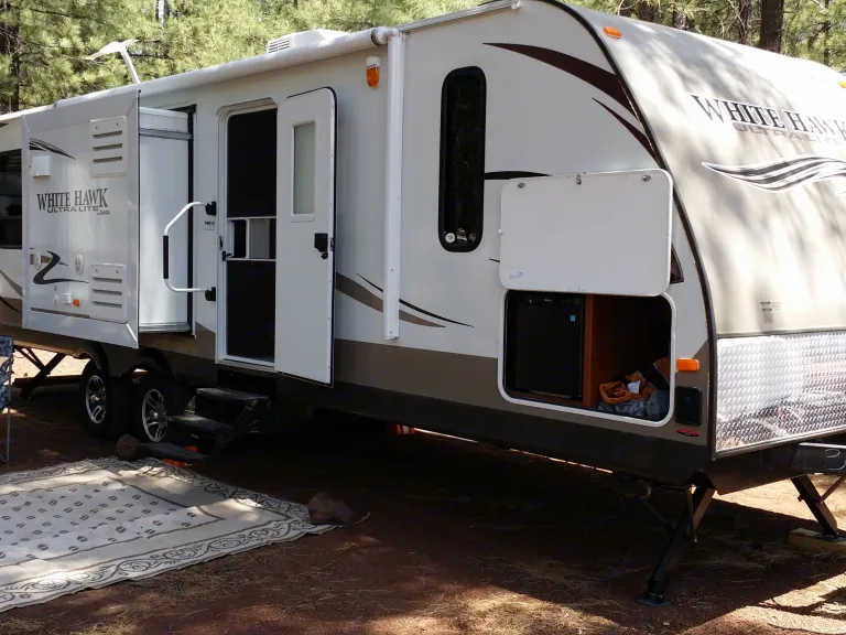 34' Jayco White Hawk Ultra Lite travel trailer. Light enough to be pulled by any base model American made truck (RAM 1500, Ford F150, Chevy Silverado 1500, etc...). Sleeps 5. Private bedroom in front of unit. 2 slide outs form living room with wrap around TV when living room Queen bed is deployed. Full kitchen (range, oven, microwave, fridge, sink, etc...). Heat can be run with electric or propane. AC, full bathroom (sink, toilet, shower), and plenty of cabinet space. Awning and outside fridge. Electric jacks and stabilizers make for quick setup and tear down. TV and DVD player in living room and private bedrooms. Has cable hookups and DirectTV Swim.