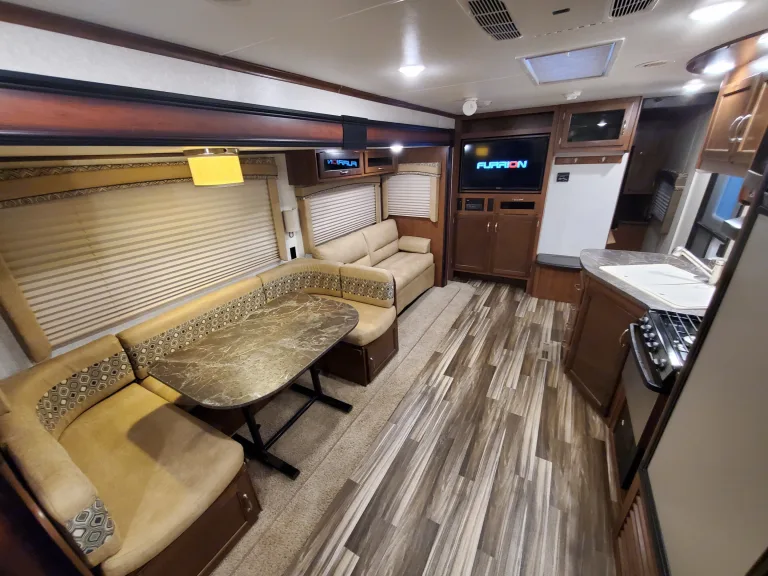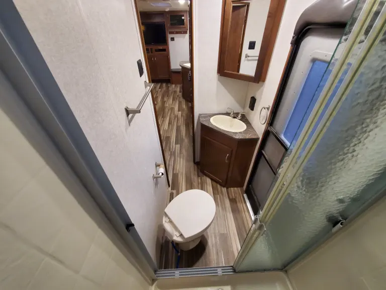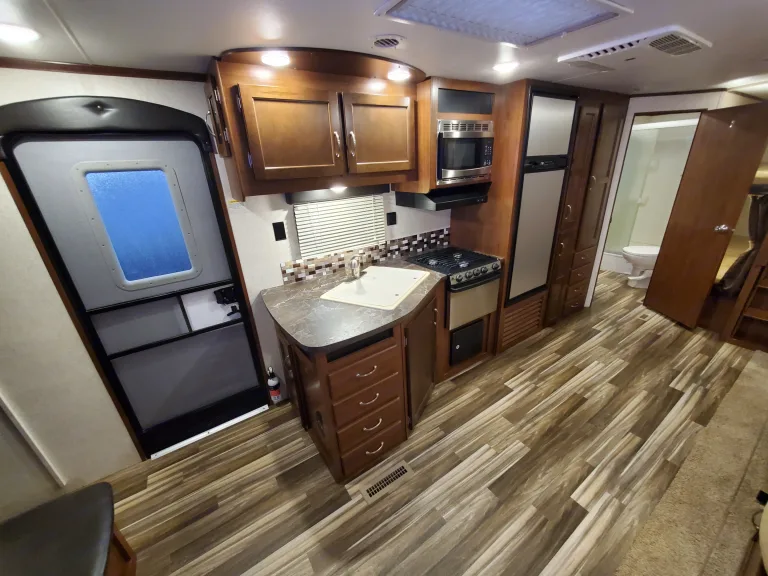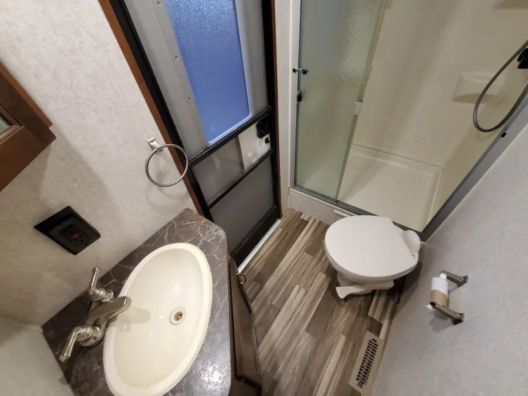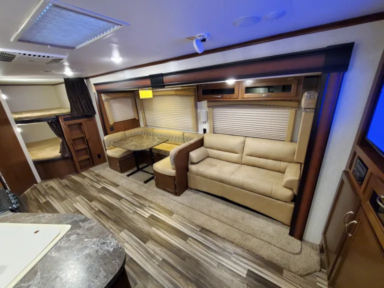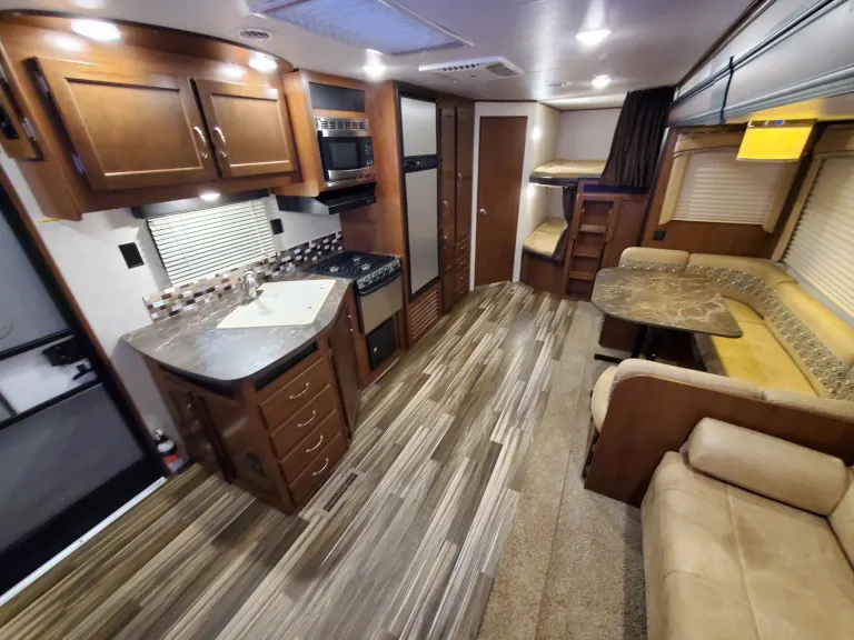 2017 Jayco 28bhbe floor plan. This is a 30 ft trailer sleeps comfortably up to 10 people. This trailer has a massive 76 gallon water storage more than double the average size. Great for off grid camping. Trailer comes in around 7600 lb dry so it can be towed with a half ton truck or suv. Front private Queen bedroom. Large deep slide out for couch and dinette. Full size rear bunk beds. Spacious bathroom with separate entrance from outside and a shower big enough for two adults. Very nice layout for large family. 20 ft Electric awning. Arctic Four Seasons insulation package with sealed underbelly. Ducted AC and heat furnace. 32-in TV with DVD player. Bluetooth stereo with indoor outdoor speakers. Electric tongue jack and stabilizing jacks. Weight distribution hitch and Generator available. Three night minimum requirement. Damage deposit required. Holiday rates and special event pricing May vary.