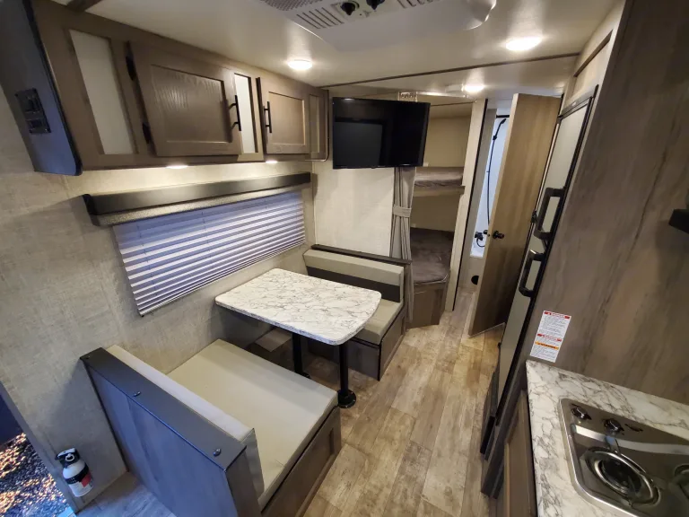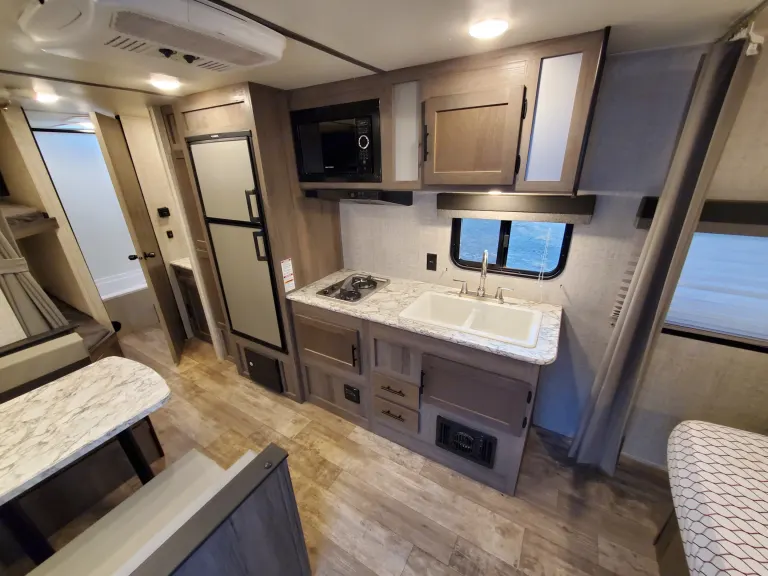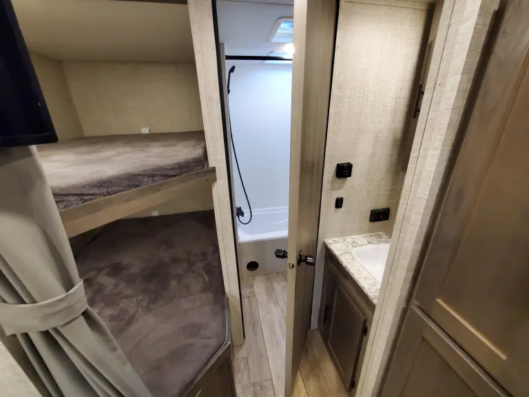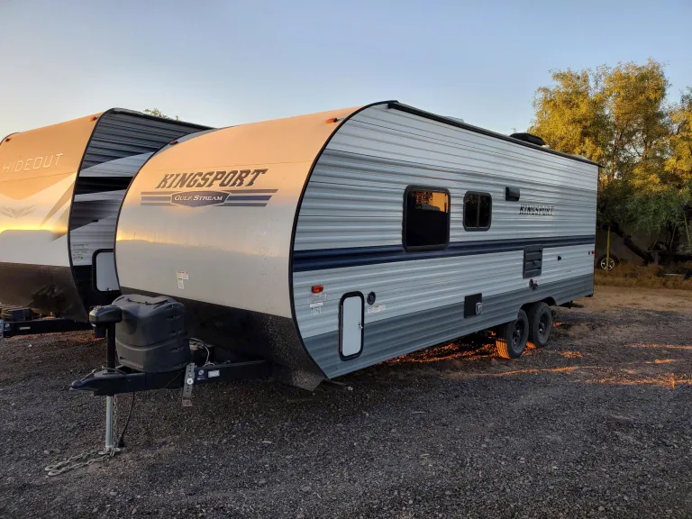 2021 Gulfstream ultra light Kingsport 248bh. This trailer is only 3,899 lb unloaded. 30 gallon water storage. Sleeps up to eight people. Full size rear double bunk beds. Front walk around queen bed. Dinette converts to twin. AC and heat furnace. 14 ft electric awning. Electric tongue jack. Bluetooth stereo indoor outdoor speakers. Easily can be towed with a smaller truck or suv. Very open floor plan with sleeping for everyone. Full size refrigerator. Weight distribution hitch and Generator available. Damage deposit required. Three night minimum requirement. Holiday rates and special event pricing May vary.