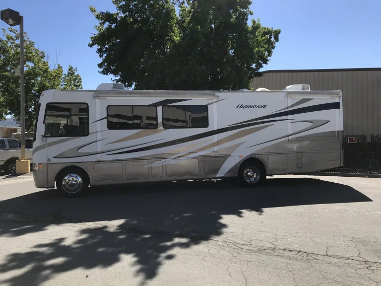 2011 Four Winds Hurricane 34B Bunk House RV features an impressive list of equipment including a large LCD TV in living room LCD TV in bedroom, entertainment center, fully automatic hydraulic leveling jacks, leatherette euro-recliner with ottoman, fully welded tubular steel floor system, fully welded tubular aluminum roof and sidewall cage construction, foam insulation, satellite prep, cable TV prep, rear queen bed with innerspring mattress, bedspread and shams, attractive headboard with sconce lighting, lighted rear wardrobe, glass neo-angled shower, entry door with deadbolt lock, telephone jack, systems control center, smoke, LPG, carbon monoxide detectors, fire extinguisher, slide-out battery tray, 22.5in. tires, polished aluminum wheels, Onan Marquis Gold 5500 KW generator, 50 amp service cord, gas/electric water heater, (2) roof A/Cs, ducted A/C system, raised panel doors on wall cabinets, soft touch vinyl ceilings, oil rubbed hardware, incandescent ceiling lights, double door fridge, 3-burner range, laminate countertops, flip up kitchen extension, slide-out pantry, exterior partial paint package and graphics, electric patio awning, outside shower, back-up camera with audio, heated remote exterior mirrors, one piece fiberglass front and rear caps, one piece windshield, slick fiberglass exterior, seamless roto-cast storage compartments, Energy Star Approved premium TPO roof, roof ladder, electric entry step, AM/FM dash radio with CD/WB & iPod & Sirius satellite ready, wood grain dash insert, dash fans, generator start switch on dash, 3-point seatbelts on driver's and passenger chairs, deluxe exterior mirrors, fog lights, 5,000lb. hitch, 80in. ceiling heights, residential linoleum in galley, bath and entry, metal entry grab handle and more. Four Winds RV is part of Thor Industries. The Hurricane is one of the most recognized models in the RV industry