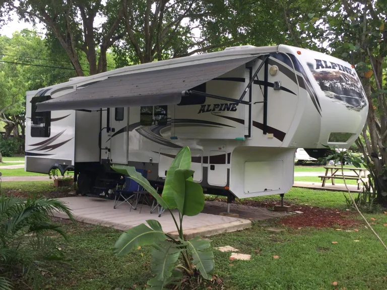This is a luxury rental, extremely well-suited for anyone wanting all the comforts of home! This is perfect for anyone spending the winter in Florida or needing temporary accommodations for work.It features a full king size, Select Comfort-style adjustable air bed, a washer/dryer, full 60" residential shower, residential kitchen with island, 5.1 surround sound home theatre with 42" TV (32" TV in bedroom, too), cozy fireplace, comfy leather recliners and sofa bed, and central vacuum! There are two ducted a/c's, one is also a heat pump.The woodwork and cabinetry are beautiful with cherry hardwoods and wood blinds in the living area!Please see the pictures for a full list of features of this RV.This RV is located at Miami Everglades Resort in Miami Florida. If you're looking for a winter haven, this resort is amazing! If you're staying here, we can setup and breakdown the RV on your campsite for a fee. If you're staying at another local campsite, we can move the RV there for this same charge plus a mileage fee.And, of course, the RV is available for you to take on your trip, provided you are experienced towing 5th wheels and have an appropriate truck to tow with (15,000lb Mgvw).