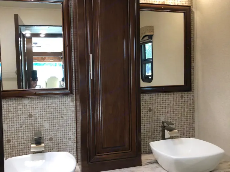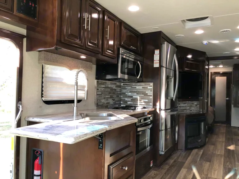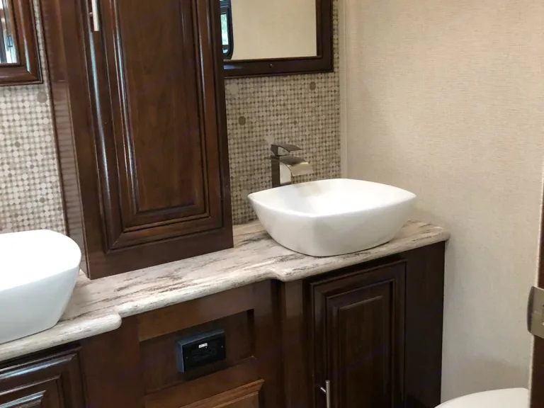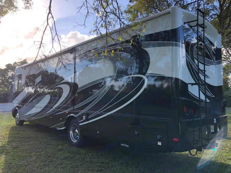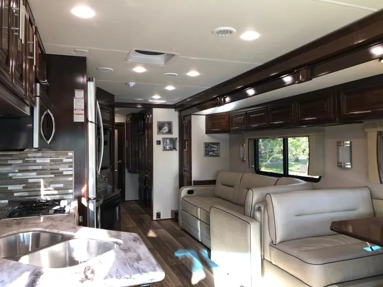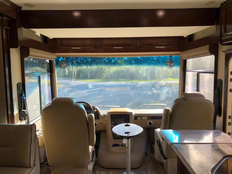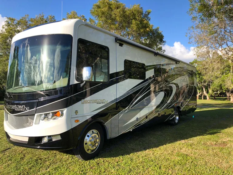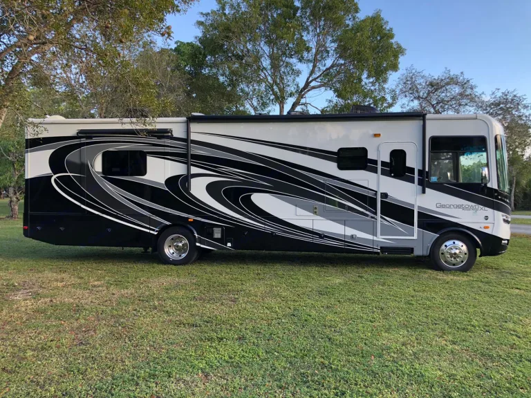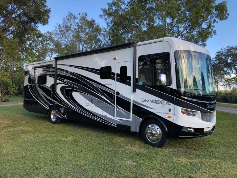 Luxurious Class A. This Forest River, 2018 Georgetown, 36.9 XL, Class A Motorhome is powered by a gas Triton V-10 on a Ford Chassis. Features include: Two slide-outs, one awning, 1.5 baths (shower), 3 flat-screen TVs (one outside w/ stereo), outdoor shower, electric fireplace, waterproof faux barn wood laminate flooring, full-sized residential freezer/refrigerator with ice maker, Onan generator, 24-gallon propane tank, full kitchen with solid surface countertops, 3 burner gas stove, microwave, oven, dual stainless sink, Bluetooth throughout, Cable and Sat ready, 3 people reclining leather sofa, pull-down sleeper sofa, dining room table - seats 4 and fold away to sleep 2, day and nightshades, washer/dryer combo, Queen sized bed, under carriage storage, side/back up cameras, power mirrors, auto-leveling jacks, and dual grey and black water tanks.•Towing a vehicle/trailer is not permitted (no exceptions). We will enable a bike rack hitch when the addon is chosen