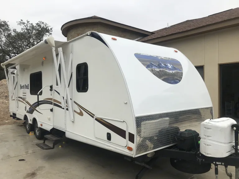 North trail 28BRS feather light trailer weighing only 5100 lbs dry, light enough for a 1/2 ton pickup.This baby is very spacious and comfortable for a large family vacation. All LED light which allows for long boondocks nights.ITS Best Features FOR Rving:> Easy access door to bathroom for those days spending time outside.