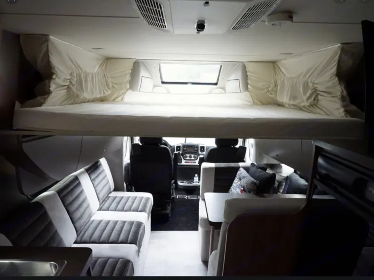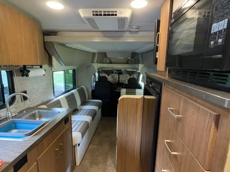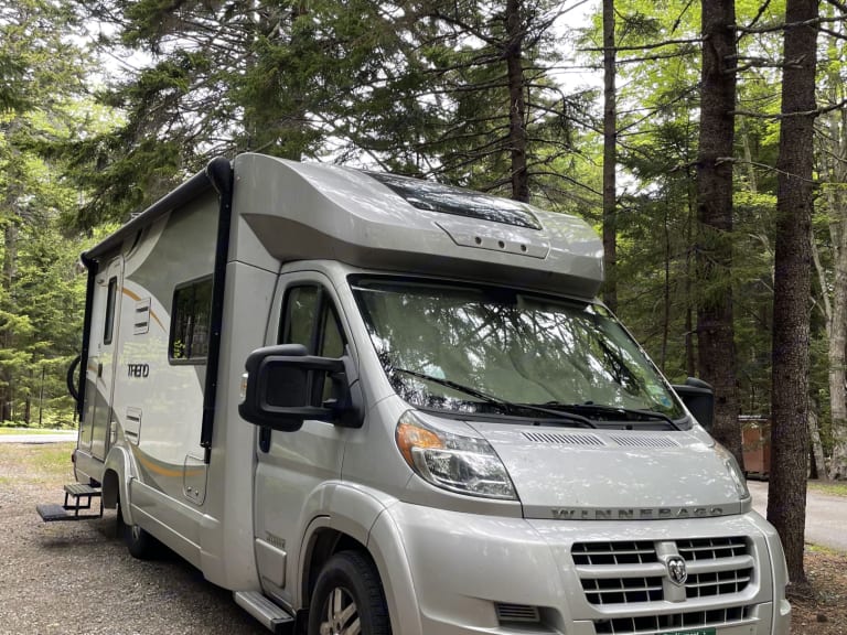 My kids named our RV Big Yoshi, and it is a great rig for anyone who doesn't want a hassle. Purchased summer 2020, and two teens and I used it full-time September 2020- June 2021. We logged 23,000 miles in 8 months and still love it! The turning radius is very tight and it will fit into one parking space by backing in and hanging the rear bumper over the curb. You'll be able to fit into just about any place that allows RVs. Clever interior design: the queen bed has an electric lift in the ceiling above the dinette--raise it to the ceiling during the day so it's out of the way, lower it at night to sleep. The dinette area is directly underneath, and converts to an area slightly larger than a California King. Very space efficient. There is a small fridge and freezer (larger than a "dorm fridge" but smaller than what's in your kitchen), two-burner gas stove, microwave, ceiling vent and fan, gas furnace for heat, and an electric AC/heat unit. Continuous propane hot water heater--no 6 gallon water tank that's going to run out. One main outside storage compartment, and another for the water hose. Leveling blocks provided but rig does not have any jacks.What's includedAs requested (can include or remove as you prefer):