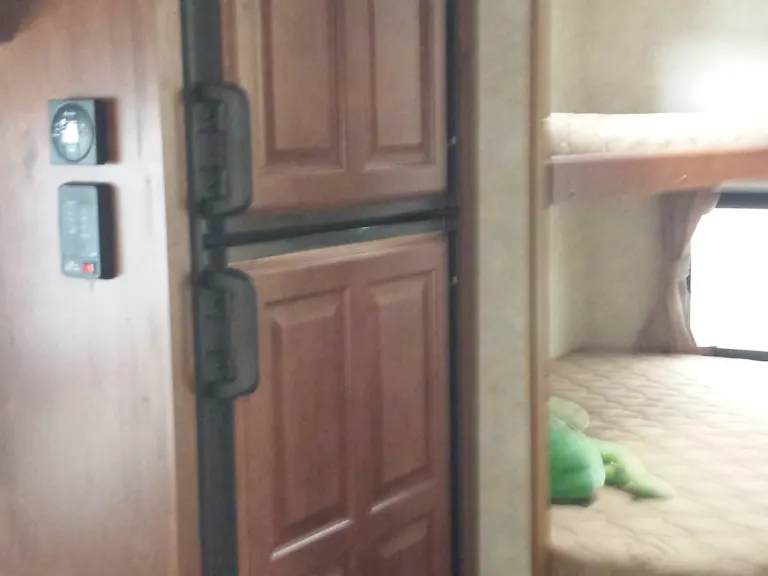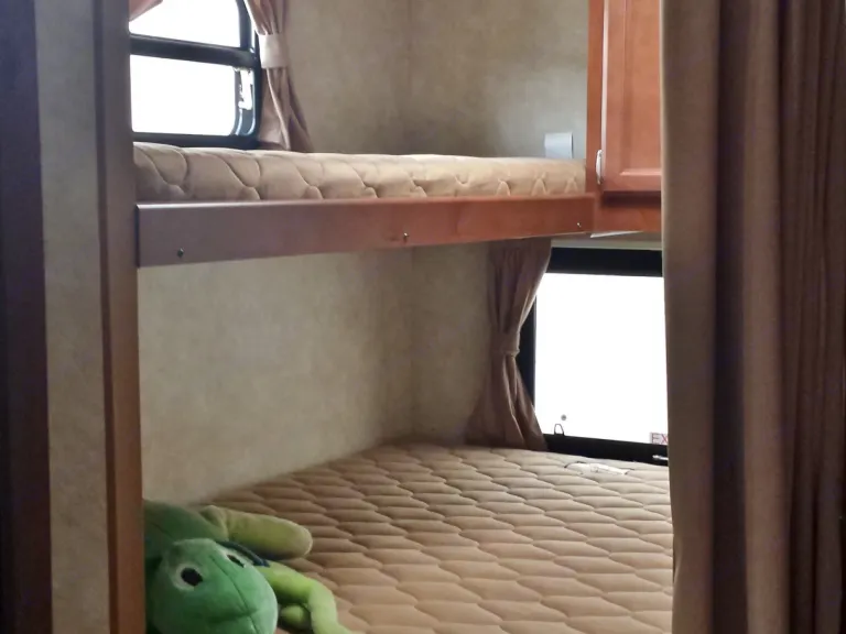 The 28BKS is a half-ton or SUV towable bunkhouse with a half outdoor kitchen. The entry door opens into the living area where the sofa and kitchen slide out to provide more living space. The full size dinette booth is across from the sofa (sofa and dinette collapse for additional sleeping space). The master bedroom is in the front of the coach and has a privacy wall that doubles as the entertainment center. The queen bed is a full walk around with a privacy door on each side of the bed. The rear bunk bed is a double bed bunk with a single bed bunk over top. The bathroom is a full bath equipped with a sink, tub with shower surround, foot flush toilet and medicine cabinet.