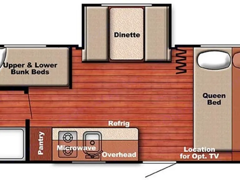 The 19DS has a front bed and two rear bunks. The table will collapse for additional sleeping. The kitchen is centrally located and features a double door fridge, microwave, 2 burner stove and sink. The bathroom is located in the back of the unit and features a toilet and tub/shower.
