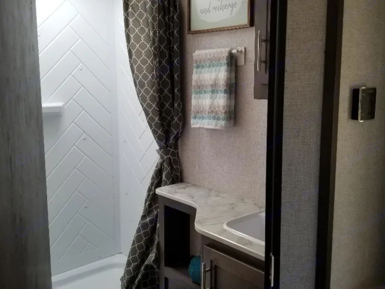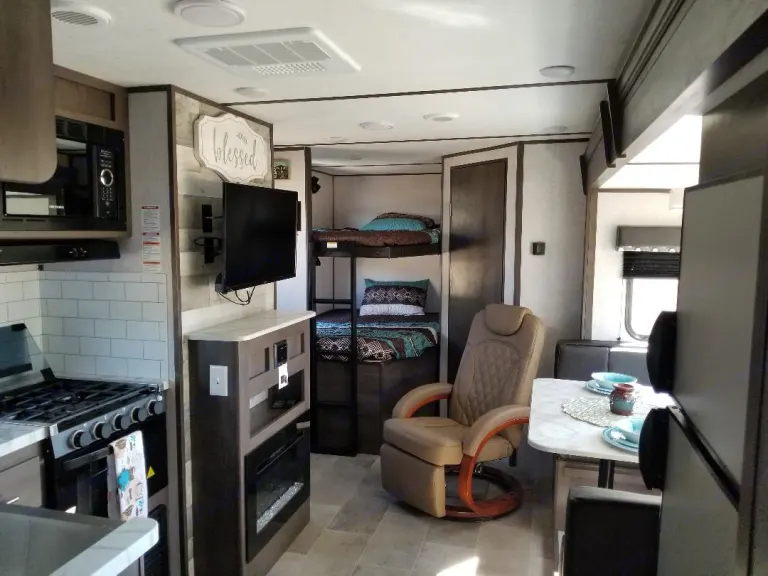 I love Lucy, our brand new RV. We think you will too! Lucy sleeps 4-8 but is so easy to tow that a half ton pick-up or large SUV can easily handle her. She is perfect for glamping, events, or family fun. Set up is a breeze with the automatic stabilizers and electronic hitch. Lucy has a separate bedroom with a walk-around queen bed with a hybrid gel-infused mattress topper and plenty of storage. There is also a bunk room with 2 full size beds and an additional full size bed when the table is converted. Each bed has new bedding and there are towels in the bathroom. There is cute new décor throughout. The trailer has all of the bells and whistles: recliner, fireplace, outdoor kitchen and shower, microwave, stereo inside and out, TV and large pantry. It will come with a well-equipped kitchen that includes cookware, dishes, and even a Keurig coffee maker. The trailer can be picked up or My husband can deliver and set it up at your camping location with notice. You can add on an outside fun package that includes a grill, camp chairs, lounge chairs for the beech, tables and games such as corn hole.What's includedTrailer Provided ContentsBuilt- Ins:
