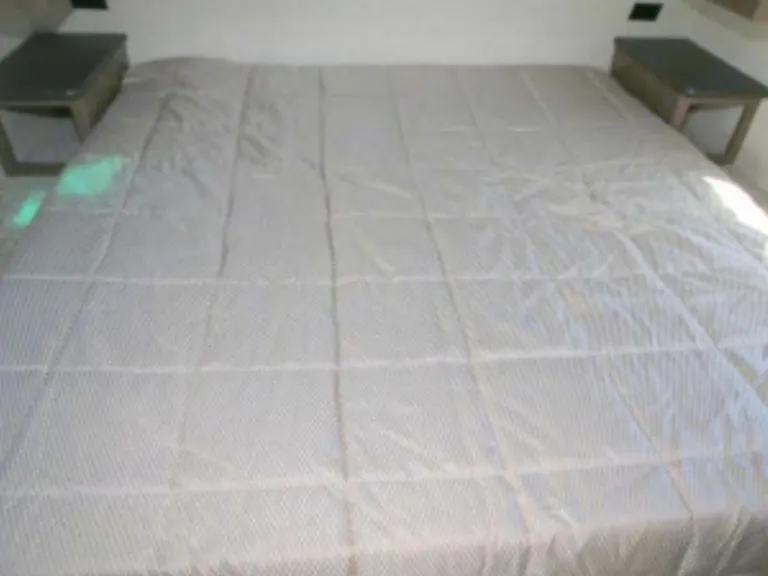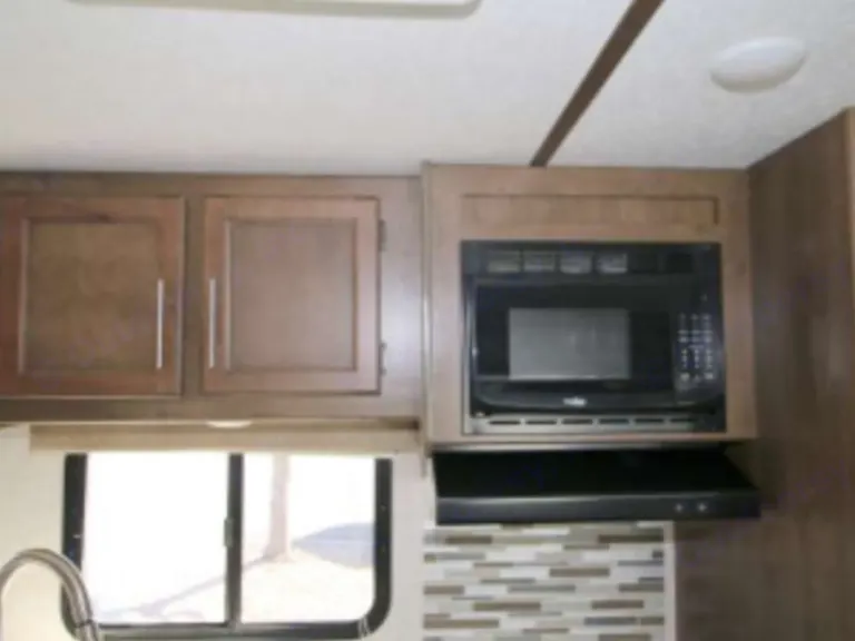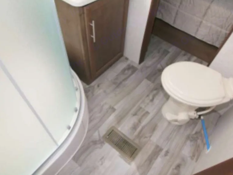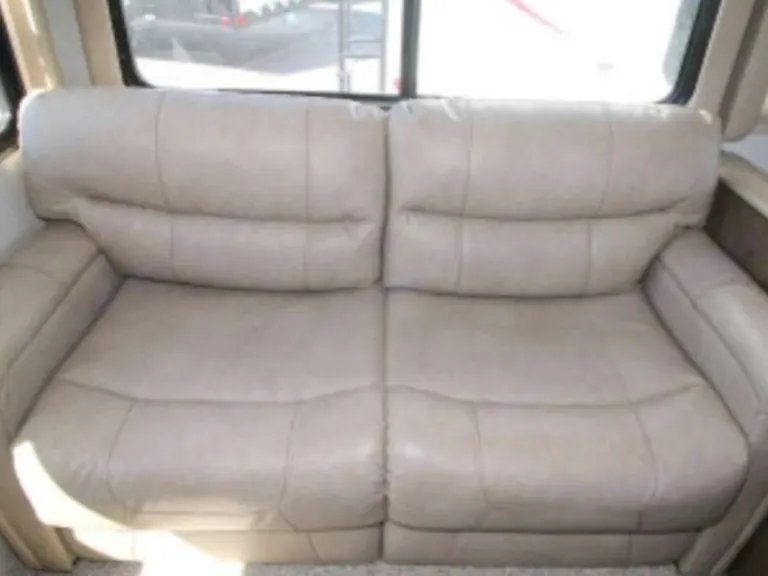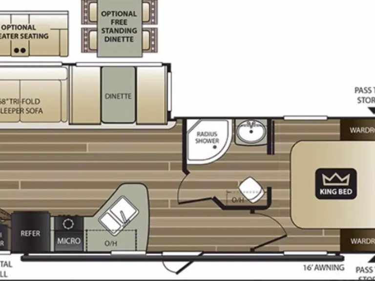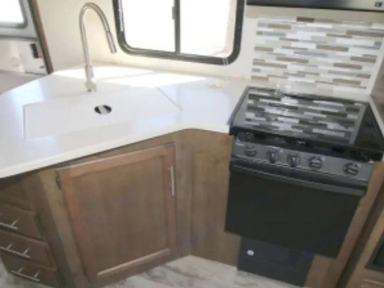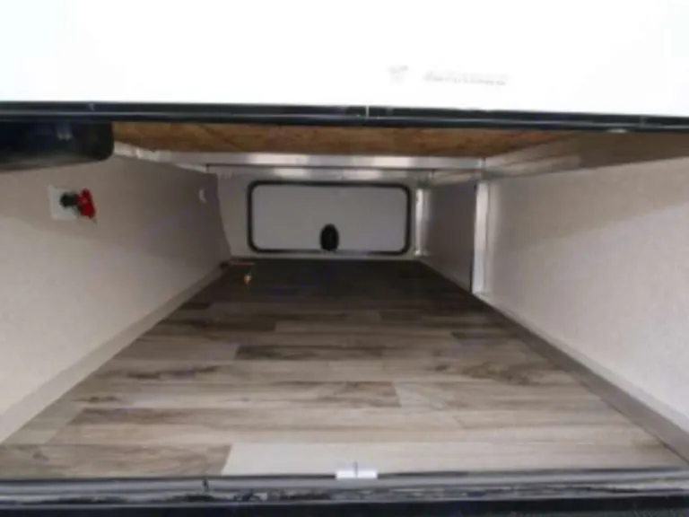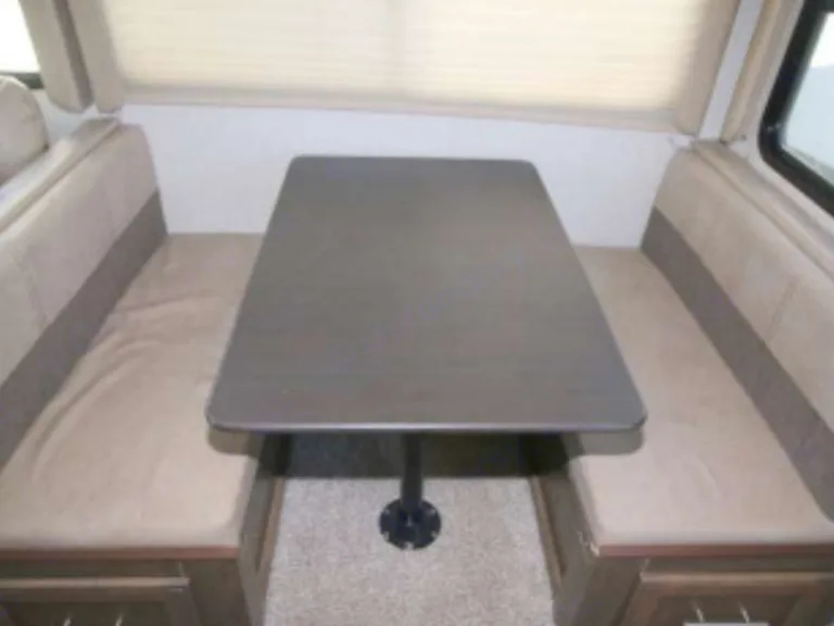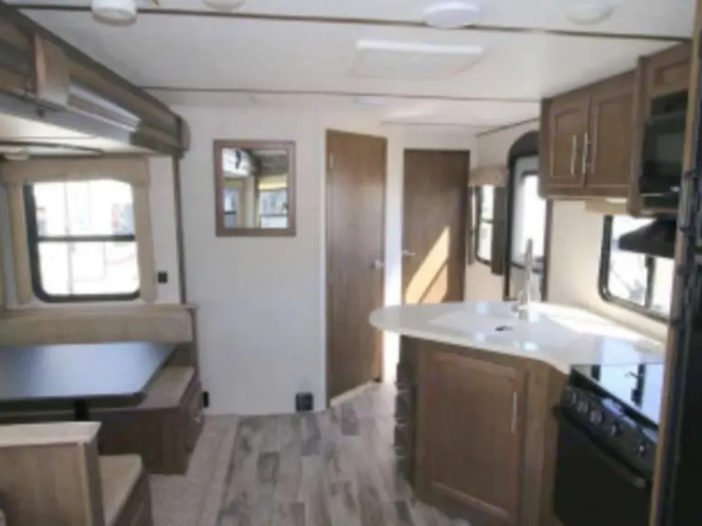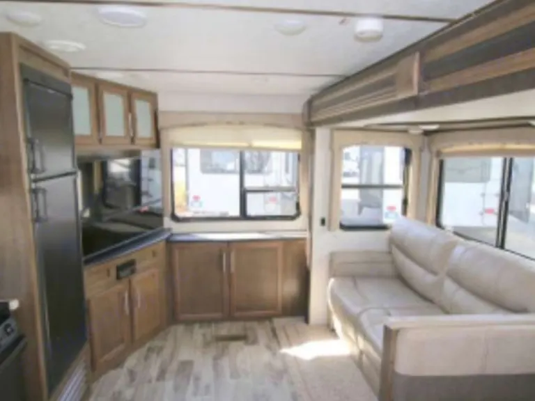 King size bed in private roomThere are plenty of overhead cabinets throughout the trailer to hold your camping necessities as well as a drop frame pass-through storage to easily access and store your outdoor gear, plus additional exterior storage. While you are whipping up your best meal in the kitchen, you can socialize with the rest of your group as they sit comfortably in the leather loveseat. You will also enjoy serving your meal on the countertop extension and enjoying it at the booth dinette. By having the walk-through bath, it allows everyone to have an easy access, especially if you are staying in the front private bedroom.This trailer has Auto Leveling and with the torsion axle and rubber-ryde suspension you will enjoy a smooth ride. The trailer is easy to tow with any sized truck bed and comes with standard easy lube axles and Nev-R adjust brakes to ensure for a safe and smooth arrival. To keep you cool on a warm day you will enjoy the A/C unit and to warm you up on a cooler day, there is a quick recovery auto ignition gas/electric water heater for a hot shower. There is an LED TV for entertainment, a fully stocked kitchen for cooking and anything else we can do to make your trip better, let us know!What's included2 camp chairs, linens, cookware, utensilsOther things to noteNo smoking!