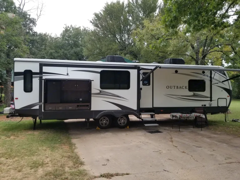 It is equipped with a self leveling system and sway bars.Please keep in mind this is a large camper, you will need a large truck to haul it.It also comes with add-ons at no extra charge to you! There are 2 zero gravity lawn chairs, picnic table, outdoor area rug and all the basics of a functioning kitchen and grill.My husband lived in this for 6 months while training in GA so it has everything you need to make it through a trip such as cleaning supplies, power strips, adapters, all the things to hopefully make you feel at home, oh did I mention 2 air conditioners! You will be grateful during those summer months!I do have family managing our camper for us, we are currently stationed overseas so I will try to make pick ups and drops offs as easy as possible for you and for my family. This may mean that I will give extra days to your reservation at no extra cost if that makes it more convenient for both parties. During your reservation process and trip I will be your point of contact, my family are doing us a favor by getting our renters access so they will not be able to assist you if you have questions regarding your reservation or fees. They are however be very knowledgeable of the unit and how to operate it.The camper will be picked up and dropped off at the storage location, no deliveries will be made. You will be shown the ropes of the camper and a few documents will need to be filled out for Outdoorsy.This camper is our second home that will we are entrusting to you to have fun and enjoy! It will be given to you clean and we would like it dropped off the same, this helps us with our renting process while we are overseas. Please note there is a cleaning fee if it's not returned cleaned.I hope this will not cause any confusion and we definitely appreciate your flexibility with us!Please try to book in as much advance of your dates as possible, there is a 12 hour time difference between me and you so I may not be able to respond immediately but I will Asap, if calling please leave a message. The more advance the booking the better we can get all the arrangements worked out and make the pick up and drop off easier.