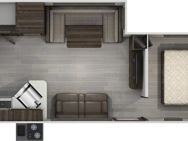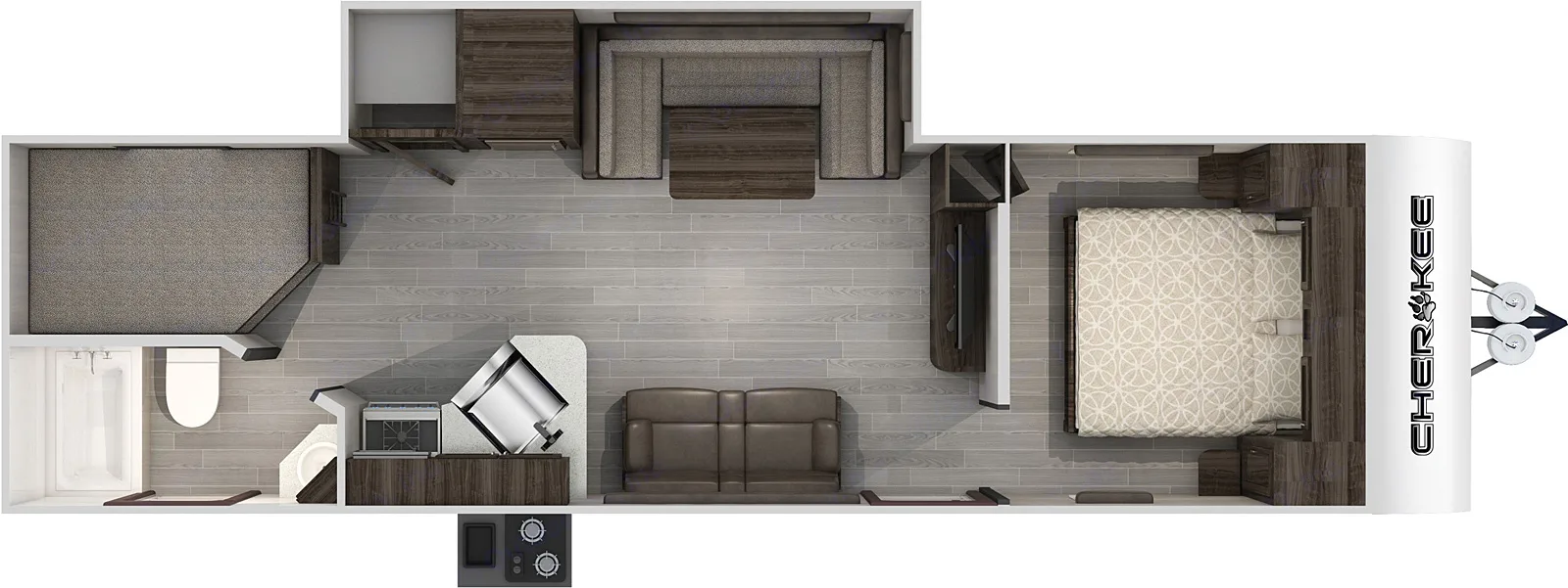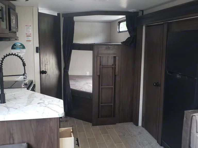 Cross conversational seating in the living room and big picture window make this camper unique. The spacious kitchen includes black stainless appliances, a farm sink and a full-size pantry. Outside enjoy the Cherokee Camp Kitchen with a refrigerator, a stovetop, hot and cold sprayer and an icemaker. There are two adult sized bunks in the trailer and there are two entry doors for convenience and safety. The bedroom has a walk around bed and two wardrobes with built-in cabinets over the bed.
