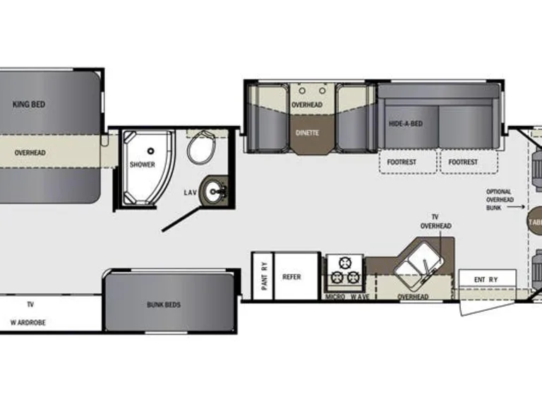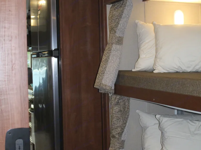 With 3 full wall slide outs, you have lots of space, for sleeping, sitting & relaxing. With a king sized bed in the back, & bunk beds in the hallway, you're not really camping, you're in a moving hotel. The amenities of this coach are plush & the 3 full Wall Slides make it feel very spacious. Coach has outside TV Entertainment center, is equipped with an on-board power generator as well as a dual air conditioner & furnace. Features :
