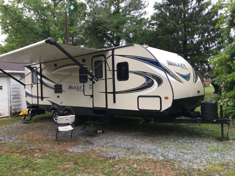 This 27 ft super clean bunk house travel trailer has everything you need for a great vacation. Sleeps 10 but 8 comfortably . Full kitchen with deep sink and completely stocked for all your cooking desires. Private master bedroom with plenty of storage.. superslide out houses the diners and the very comfy sleeper sofa..full entertainment system with indoor and outdoor speakers. Has 2 bunk beds in back with individual lights and electrical outlets. Full bathroom with entry from inside and outside which we love becouse if your sitting around the fire after the kids go to bed you don’t have to enter the cabin to go to bathroom.. outside features a 16 ft led lot awning, gas grill that attaches to camper and an outside so tons of storage under the camper and inside.. your family will love this camper