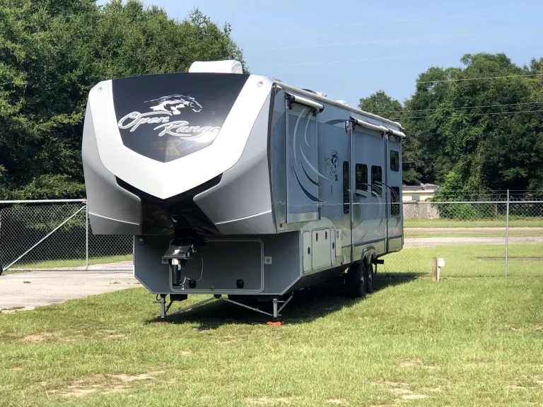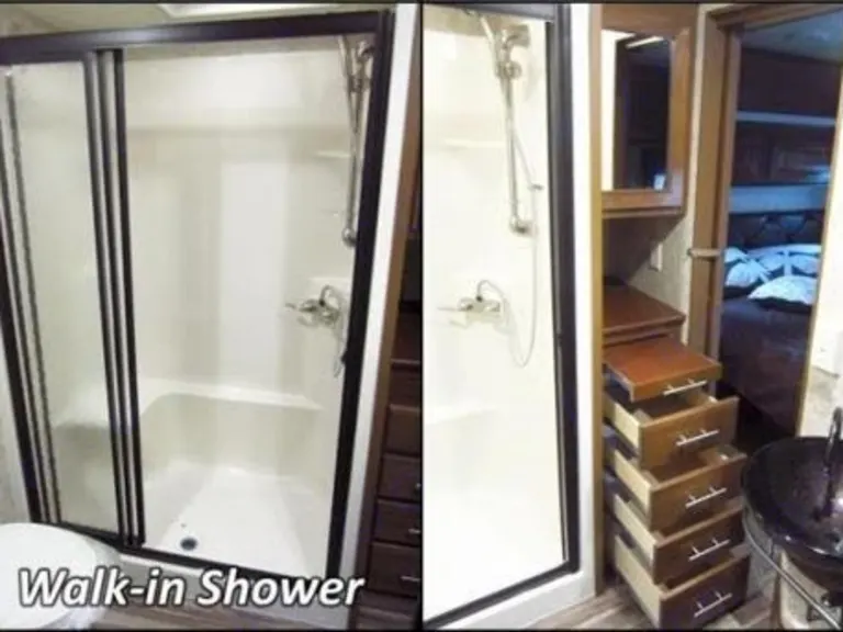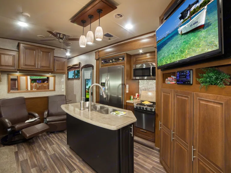 Delivery and Setup available for this fully stocked, truly year-round RV. Reservation includes linens, pillows, dishes, pots/pans, plates, cups, silverware for 8. Features a 55” TV, with perfect viewing from your pub style recliners, 2 Euro style recliners mean there’s no bad seat in the house. Comfortable bedding/sleeps 7, and if you want a “roughing it” experience roll out the sleeping bags. The opposing slide outs create a spacious floor plan in the bunkhouse. The leather couch in the bunkhouse pulls out to a full size bed. Color tones are deep and rich, giving a warm “home-like” feel. Dining table seats 4, but extension accommodates more. Large floor to ceiling wardrobe in the bunkhouse for longer stays, the owner's suite has his/hers closets, and a Splendide washer and dryer (not a combo unit). There’s a built in electric fireplace to take the edge off a cool crisp morning. For winter camping enjoy a 5,500 BTU propane furnace. 3 A/Cs mean whole-house comfort. 1.5 bath with the shower off owner's suite. It’s single piece, durable shower with privacy glass doors, and seat. Shower head is Tall...most will use with ease, but is fully adjustable/removes for more comfort. Kitchen features oven, 3 burner cook top, and convection oven microwave. Large island and double stainless steel sinks for easy meal prep. Large, 23 cubic feet, residential, stainless steel refrigerator and freezer with ice & filtered water dispenser. Take your RV experience outside as you enjoy your meals cooked in the outdoor kitchen; complete with microwave, mini fridge, and of course a camp stove. There’s quick-connect propane for your resident grill master. There’s no shortage of space, plenty of cabinets, drawers, and doors. Even your trash can has its own designated space, so your experience isn’t diminished by unsightly garbage. Take advantage of the Direct Booking feature and discover all the ways this RV is everything your crew will need to make This trip, your Best trip!