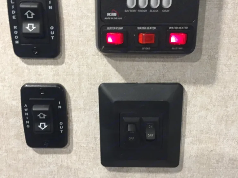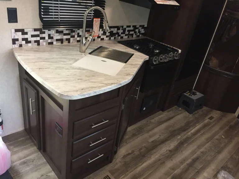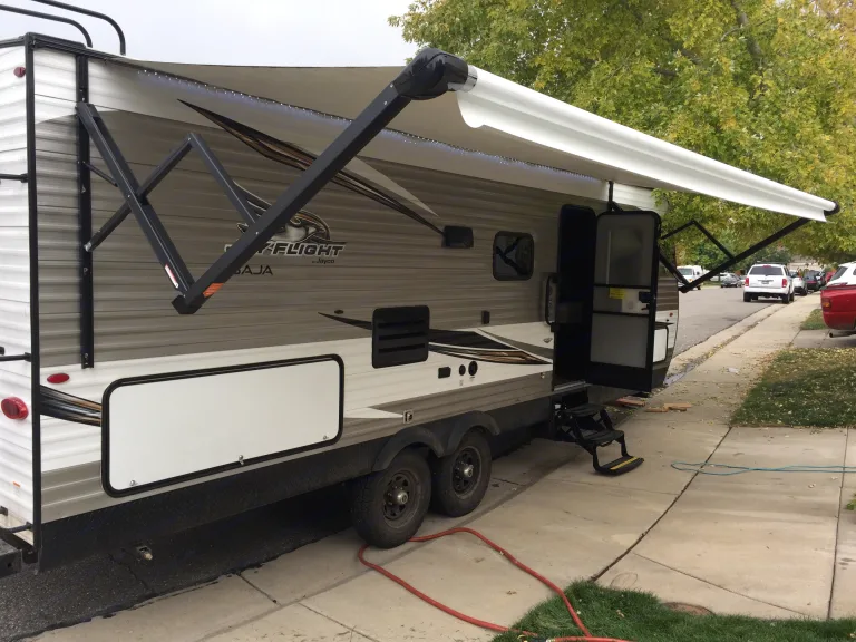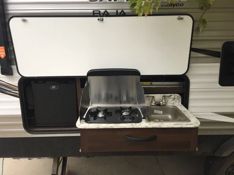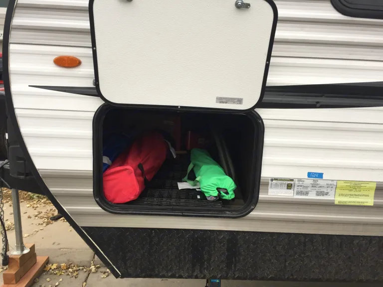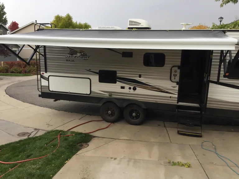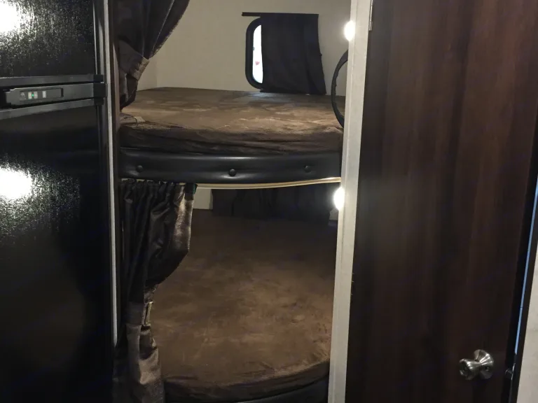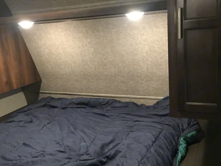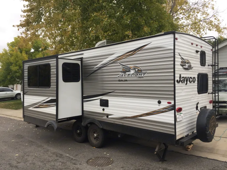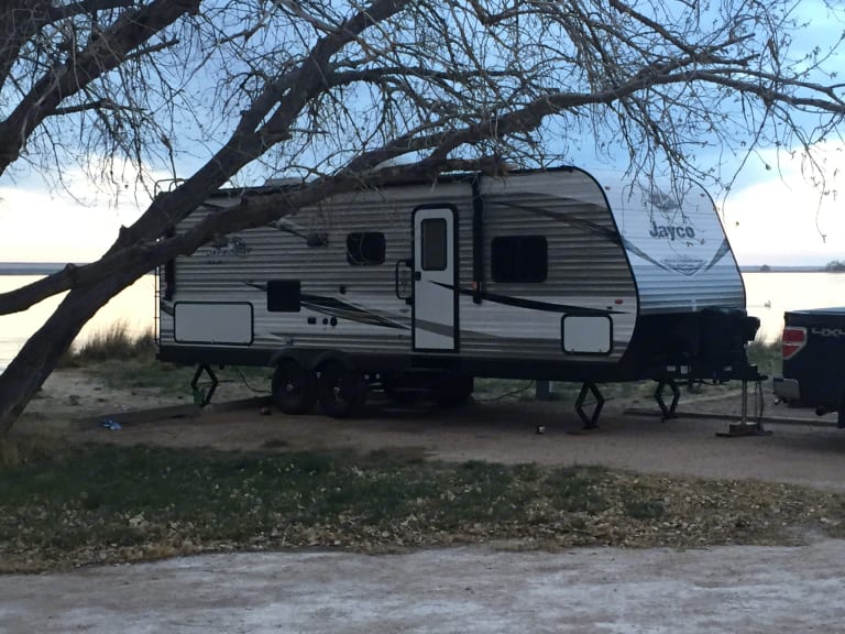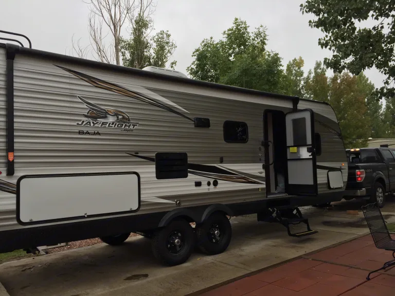 Hi! No matter where you are on your RV'ing journey, we hope we can help. The RV has a queen bed up front (which also has great lighting), double bunk beds in the back and another conversion double with the dining area. As a 2019, it has updated electronics, including an entertainment center with three sound zones (2 inside and 1 outside), a CD/DVD player and other audio ere kitchen includes a double sink, three burner stove and oven, microwave and fridge. The bathroom has a generous stand up shower (we like this better than the tiny bathtubs that usually come in these!). There is a good amount of storage throughout the inside, including generous space in the "master" area. The outside has a retractable awning with lighting and speakers, a pull out cooking area with stove and sink, a shower for washing off the mud from the day's fun, and additional storage. This travel trailer has a 24' body, 29' long in total, and weighs 5300 lbs. dry. The controls near the door also allow you to monitor the batteries, fresh, black and grey water tank levels so you always know where you're at. It has the Baja package, which gives a better suspension, so it can go more places and double 30# propane tanks, and the Rocky Mountain package, which gives a second fresh water tank (for 80 gallons total) and a power tongue jack. We want you to enjoy your time and have a great vacation, whether it is for just a couple nights or for a long stay.Things we include: