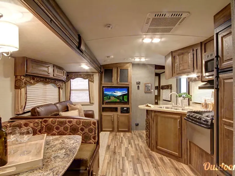 Beautiful Travel trailer. Sleeps 9 comfortably or up to 12. Master bedroom, full bathroom, full kitchen, full refrigerator, + outdoor stove and small refrigerator. Large awning that covers most of the camper. 32 HD Tv in the living room, and a small tv in the 2nd bedroom.
