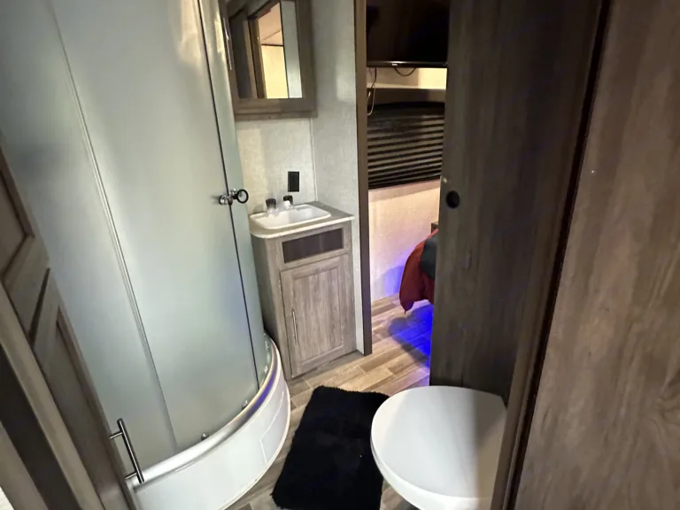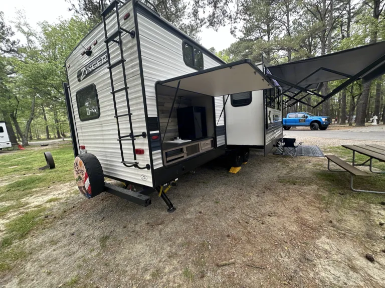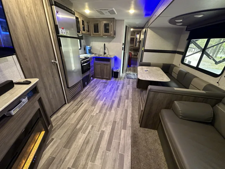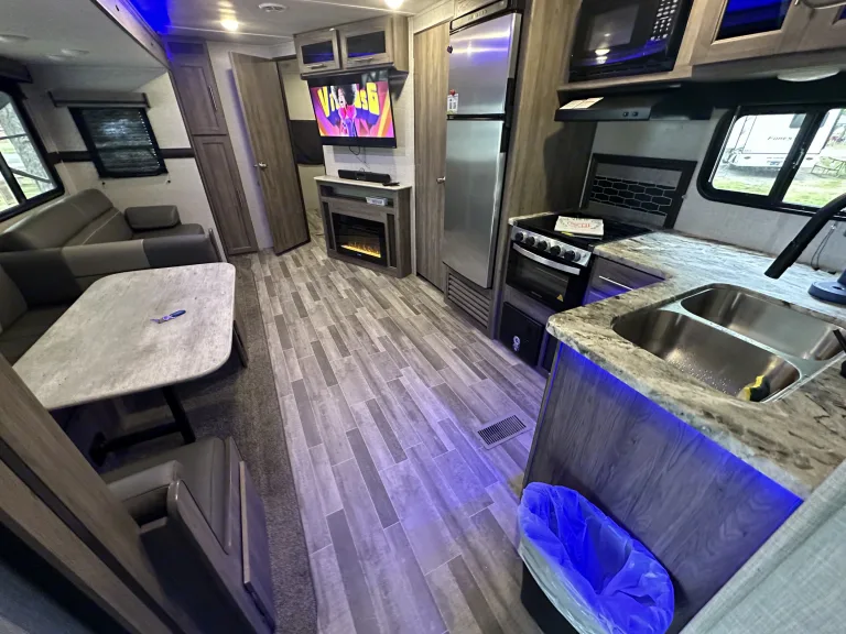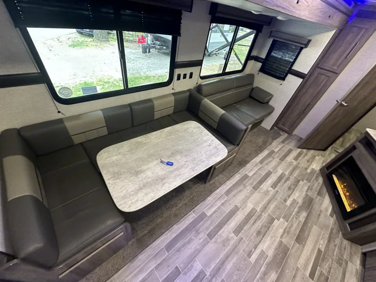 Enjoy the great outdoors in style with all the luxuries of home. This 37 foot camper with 2 slides provides space for up to 9 people. The private master features a queen bed, smart TV, dual closets, storage both above and under the bed, and direct access to the main bathroom. There you will find shower with skylight, sink with mirrored medicine cabinet, pedal flush toilet, and linen closet. The bathroom also has a second entry from the hallway. The main cabin has a u-shaped dinette and a comfy couch, both of which convert to beds. While cooking in the large stocked kitchen with fridge, 3 burner stove, oven, microwave, and pantry, enjoy music from the sound bar. Later, watch a movie on another smart TV while relaxing in front of the LED lit fireplace.Outdoor space abounds with this camper so take in the scenery under the two awnings with music from the outdoor speakers. The outdoor kitchen offers a built-in, pull-out two burner cooktop, sink, and a mini fridge to keep cold drinks close. The kids can wash off with the outdoor shower before retiring to the large private bunk room with 4 additional beds. This room also boasts additional storage with a smart tv as well! No need for disturbing you because there is a separate half bath inside the bunk room!! Other things to noteAll guest - must purchase an Interior Damage Protection Plan.