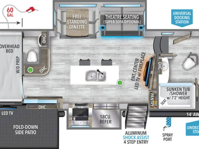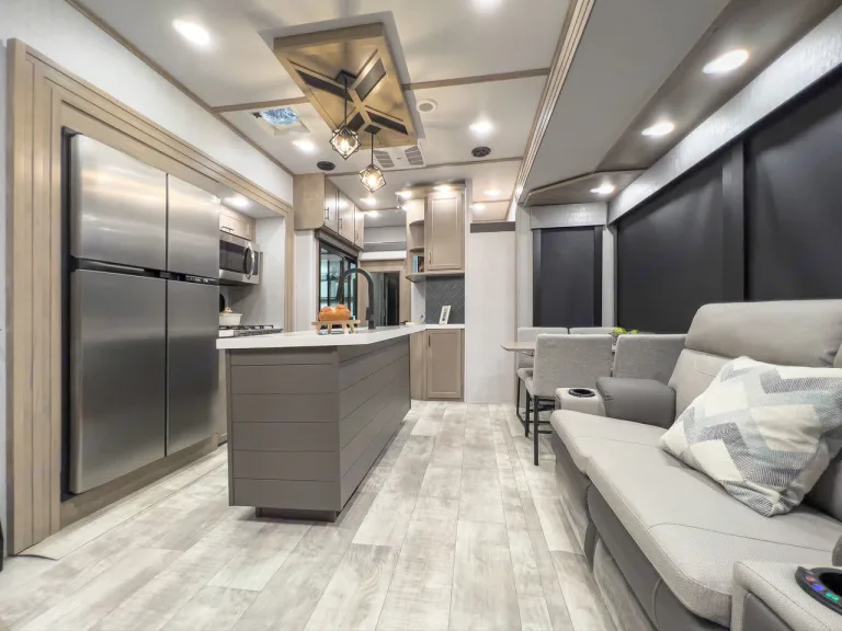 Three air conditioning units, Gas heat and electric fireplace. Gas and electric water heater, 5500 Cummins generator runs the full camper completely off grid. Side gas take for generator with a 1oo gallon fuel station for ATV's and other things. Gas stove and oven, Microwave, fridge and freezer. Center island with deep dual sinks. Two Queen beds in the back garage that lift to the ceiling so you can run atv's into the garage. Floor anchors and rubber floor mat. King bed in master room with full bathroom. 4 Season package, R40 in ceiling, R45 in floor, R12 walls. Fully heater underbelly to function in colder temperatures. Recommend 3500 diesel with air bags in back to haul. Or rent my 3500 Cummins mega cab to haul it. Full sound system inside with 12-inch Rockford sub. 55-inch tv living room. 32-inch TV mater bed, 32-inch TV in garage, 32-inch TV outside. Dual deep cycle battery, with solar panels. Go off grid and camp anywhere Tipple axel. What's includedFresh linens for beds, towels and wash rags, pots and pans, silverware and cups. Four outdoor fold-up chairs, Sewer hookup pipe, 100 ft 50-amp 4 pin power cord.RecommendationsRecommend renting a 3500-diesel pickup with air bags in back pumped up to 85 lbs of air. This is a big unit. We have a rental pickup that can be rented as well. 2021 3500-diesel pickup Ram Mega cab high output Asin trans with air bags in back. Hitch all set up and included. Ready to go. Other things to noteWe are open to long term rentals in other warmer locations. We are willing to haul the camper to location for you if you don't know how to haul a large fifth wheel. We charge per mile to haul.