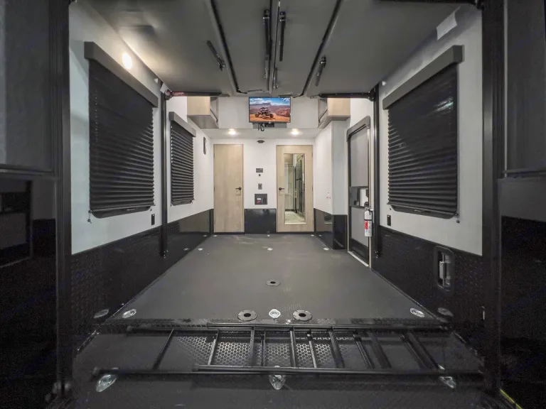 44 FT camper with side deck and sliding glass door with outdoor TV 12-inch Rockford sub outdoors and speakers. Deck out the back as well as ramp for the toy hauler. Two bathrooms with separate door access to get into back bedroom or garage with bathroom.