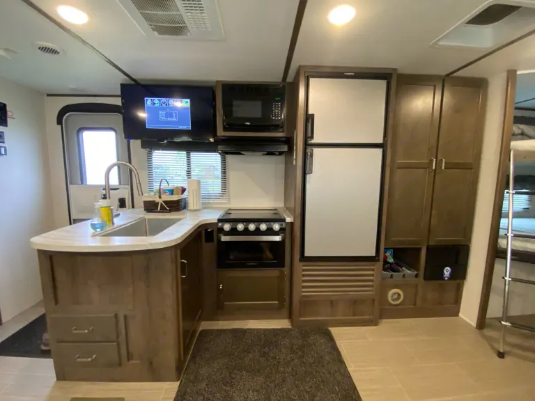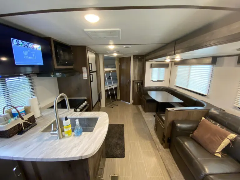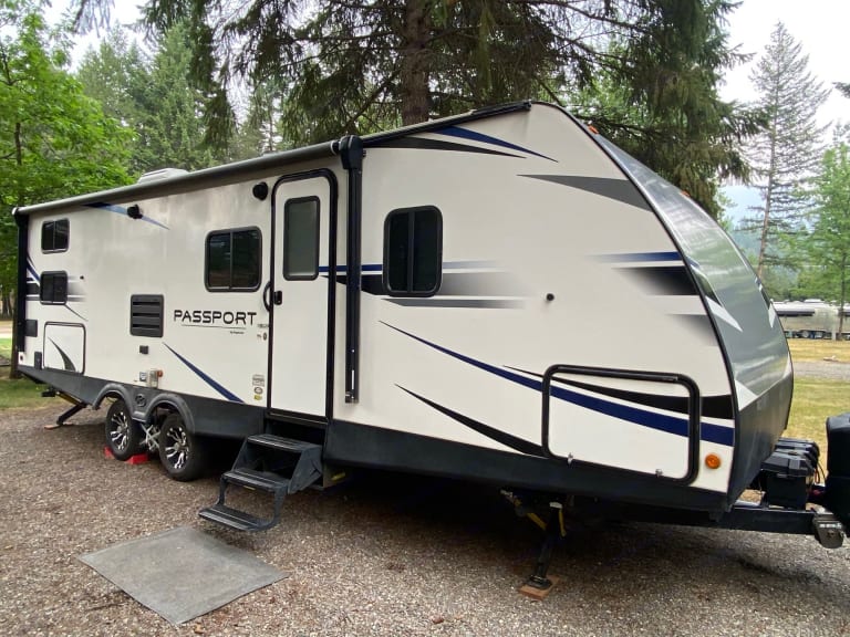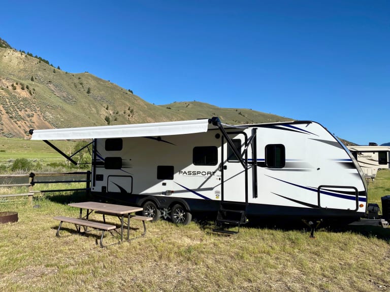 Immaculate travel trailer with queen size bed in private room, full size double bunk beds and full size trifold couch bed. Plenty of room for a family or group of friends. Free drop off and pick up with set up within 75 miles of Missoula, MT (additional cost for further distance). Camper has a TV with roof mounted antenna and a Bluetooth radio with indoor/outdoor speakers. The 19’ awning is electric and has a full length LED light strip. Lithium battery setup that lasts longer when not connected to shore power or generator.What's includedTrailer will be furnished with: