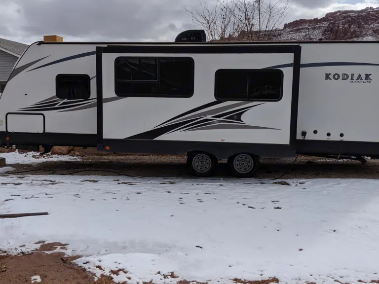 This is a perfect camper for a larger family with big beds, 2 full size bunk beds, one queen bed, plus the couch and table make into beds. It comes fully stocked with bedding for all beds, pots & pans, all kitchen utensils, dishes, towels, camping chair, and much more. It has a big living room slideout so it is very roomy. This is a big camper so if your vehicle isn't big enough to tow it we offer a set up and delivery! This RV weighs 7,600 lbs fully loaded. Check in time is no earlier than 4PM. What's includedKodiak 285BH Supply list: