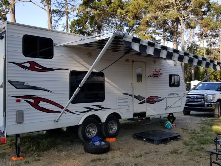 Smaller toy hauler can sleep up to 8 people. Good for family vacations and weekend getaways! Need a 3/4 ton truck to pull due to weight of the trailer.
