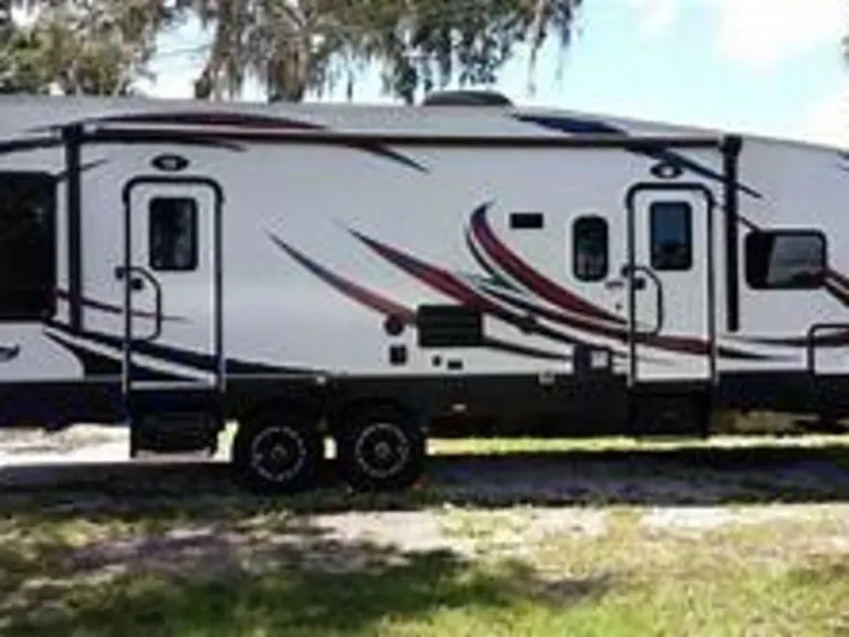 Big and Beautiful! Enough room for everyone in comfort! It sleeps 7 comfortably. One bathroom. Master Bedroom has two closets and plenty of storage under the bed. Entertainment center that turns from the master bedroom to the living space. Surround Sound System throughout. Spacious Kitchen and full fridge, Large awning, speakers, outdoor shower center, and toy hauler with a drop down mosquito net. Two queen beds in back room.