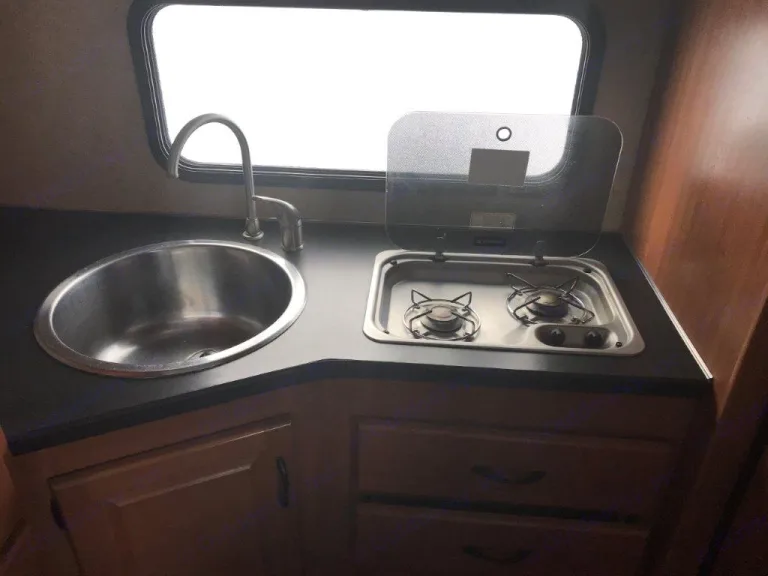 Includes: all kitchen accessories, everything you need for camping and cooking inside and outside, toaster for gas burner, dish soap, septique tank sanitizer, portable bbq (Half BBQ / half burner, runs with 1lb green coleman propane tanks), 4 camping chairs, nice corner shower at the rear. 1 King bed over cab sleeps 2, 1 dinette sleeps 2. Sheets fitting all sleeping areas are available for an extra cost, see options.
