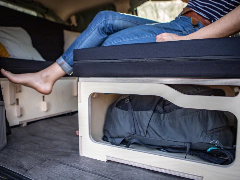 Bonjour ! Je suis une van toute équipée avec un super kit de conversion Vanpackers permettant de passer en mode 4 personnes facilement. En plus, tu auras un espace intérieur en cas de pluie ou de fraîcheur.En voyageant avec moi, tu auras droit à :