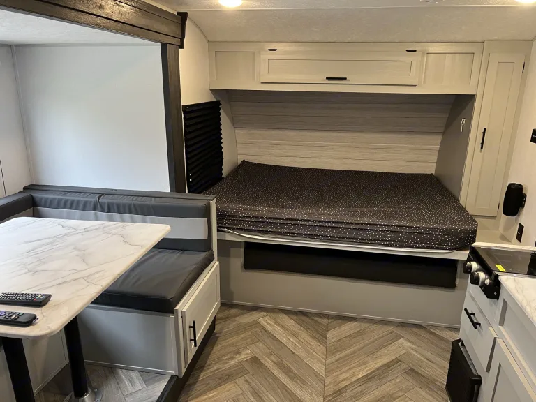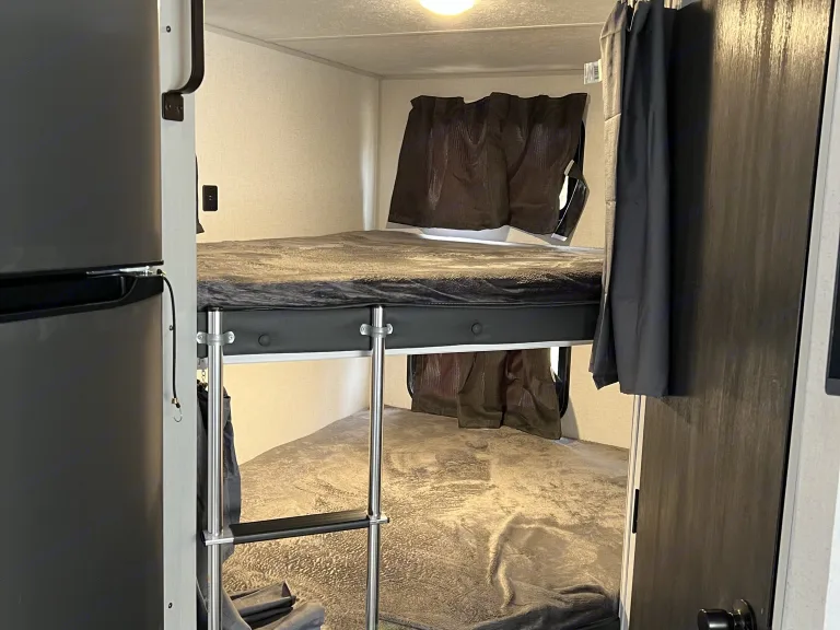 This 23ft travel trailer is great for a small family. It features wide bunk beds, a pull down camper queen bed, and the dinette turns into a bed also. *TV does not have DVD player. Can be hooked up to cable if RV park has the connections. RecommendationsComes with everything you need to get set up at a campground. 30amp electric cord with surge protector, Freshwater hose, sewer hose, garden hose to flush sewer hose, Leveling blocks and wheel chocks, Full propane tank, bluetooth speaker.Other things to noteNo pets, No smoking, No festivals