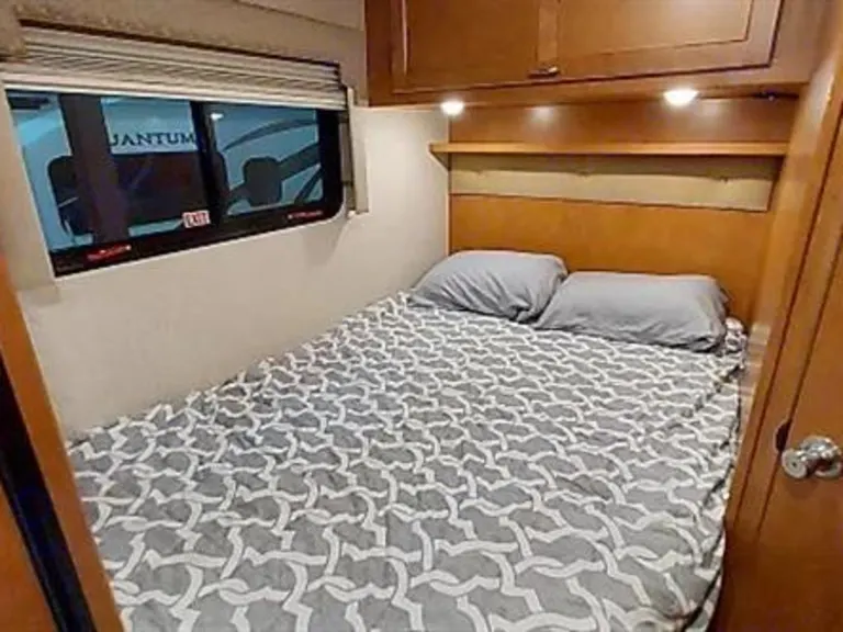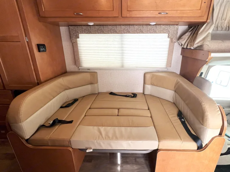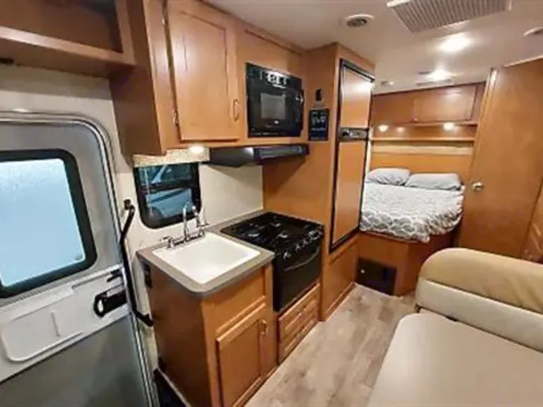 This is a great small Class C that is perfect for a small family or group with a queen bed in back, a double sleeping area above the loft and a big u-shaped dinette that converts to sleep up to two people. The kitchen is equipped with a sink, microwave, mid-sized automatic fridge, and 3-burner stove. At just 24 feet long, this RV is very easy to drive without feeling intimidating.