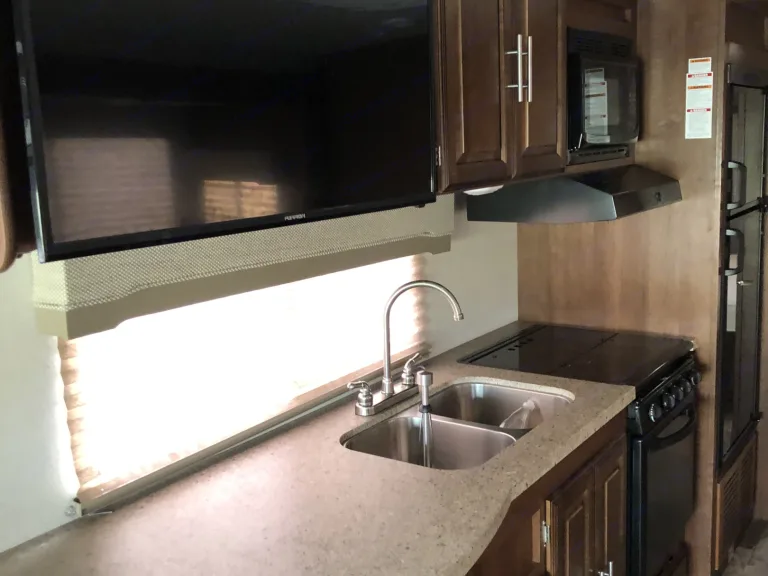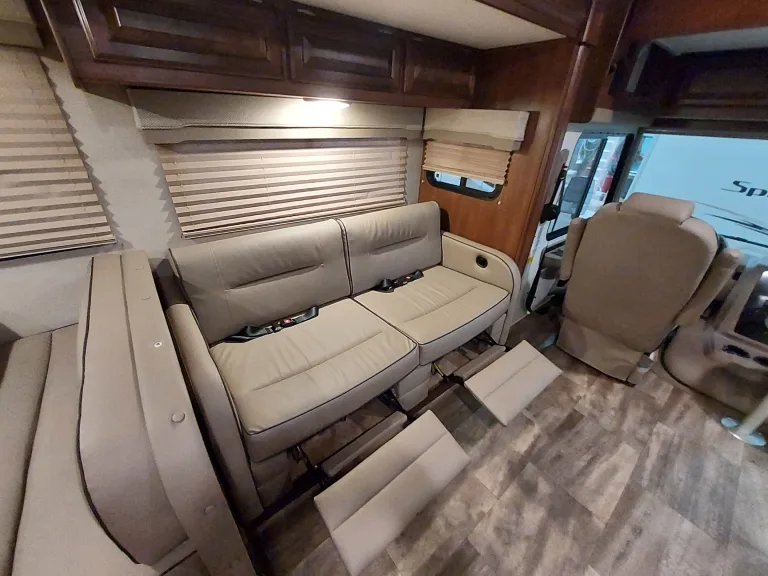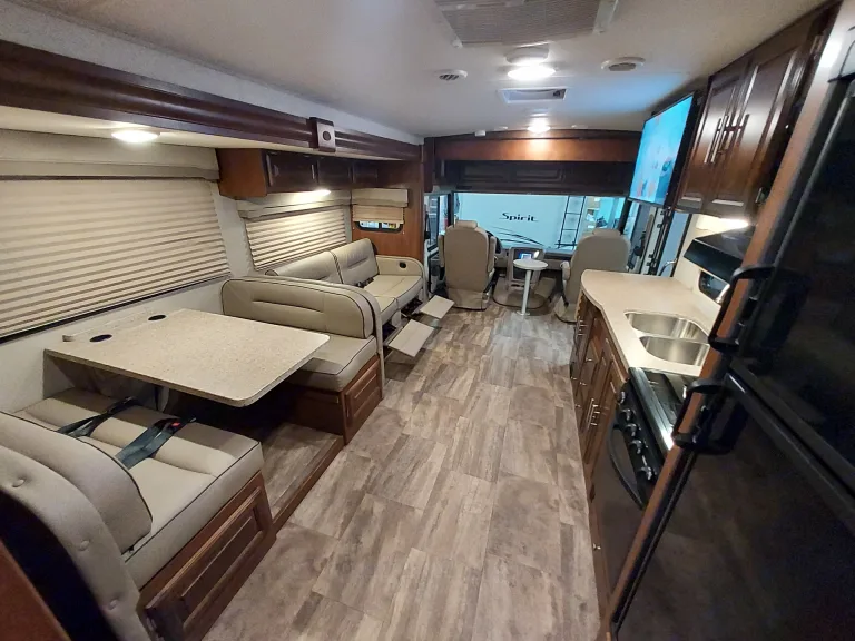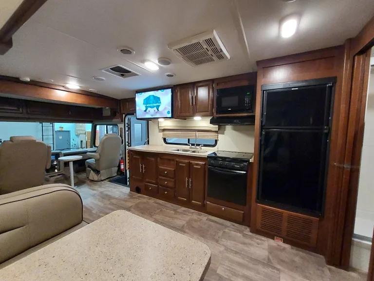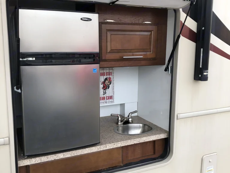 This is a great Class A for a smaller or medium-sized group and sleeps up up to 8 people with a king master bed, a double hide-a-bed in the sofa, a twin bed that drops down above the cockpit, and the large u-shaped dinette that converts to sleep two. The kitchen is set up with a sink, microwave, mid-sized electric fridge, oven, and 3-burner stove. The sofa and dinette are both on the same side of the living area together directly across from the kitchen, so when you are parked and you open the living area slide-out, you have a nice open area with plenty of room to move and live in your home away from home. To make it even better, there is also an outdoor kitchen area as well!
