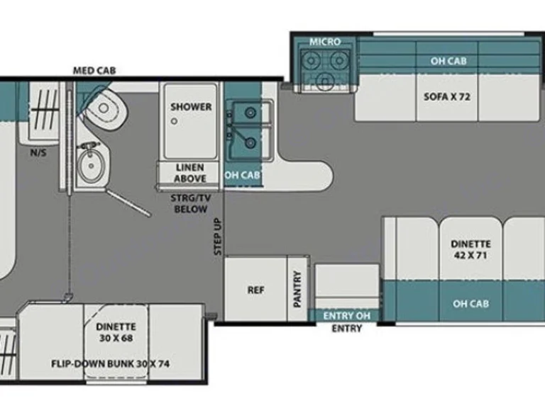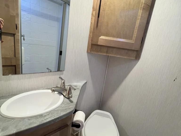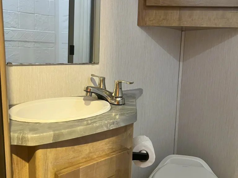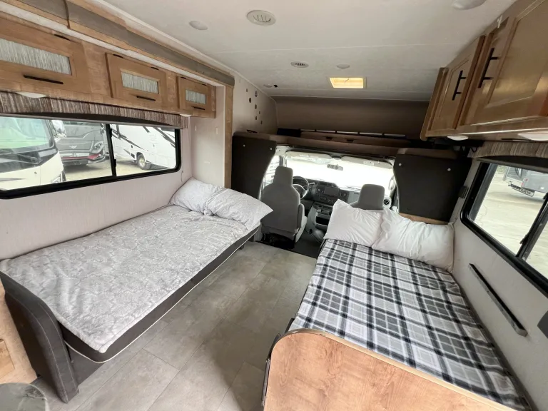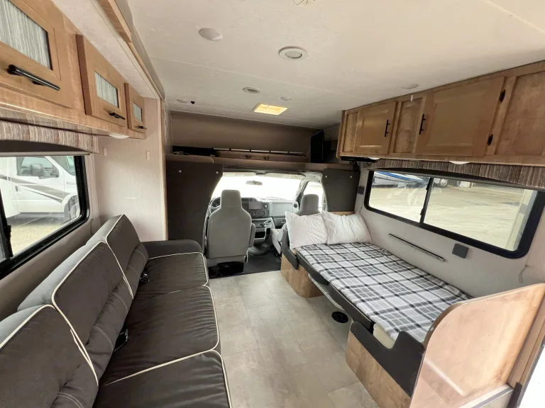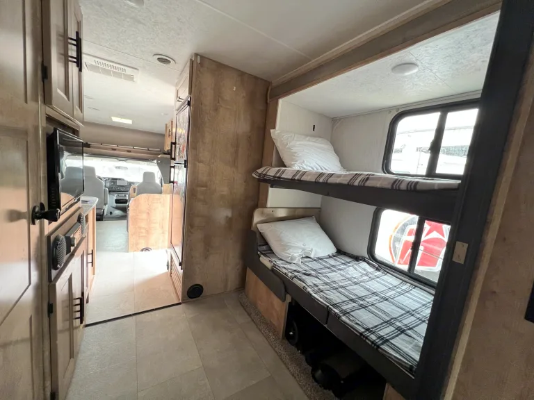 This Class C sleeps up to 10 people (with a mix of adults and children) or up to 7 adults, with a queen master, a set of twin bunks, a full loft bed above the cockpit, a jackknife couch that folds down like a futon, and a dinette that converts to sleep. The bunks are actually a second dinette where the top bunk comes down when you are ready to use it and the dinette actually converts into the bottom bunk, so that gives you extra seating when you need it. With 2 slideouts, you also get more room to move around when parked. The kitchen is fully equipped with all the necessities with a fridge and freezer, stove, oven, microwave, and obviously a sink. The full bathroom has a sink, shower, and toilet so you have everything you need.