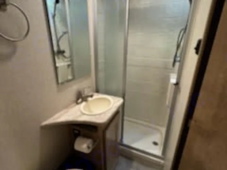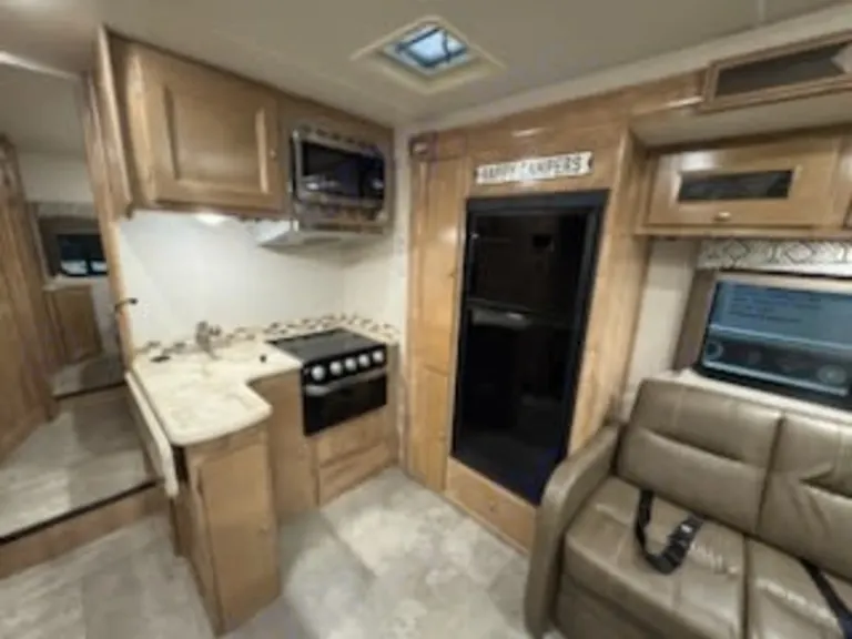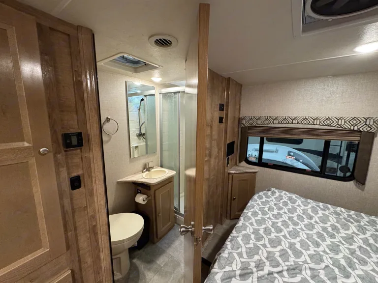 Inside, the Leprechaun comfortably sleeps up to six people with a queen bed, a convertible dinette, a pull-out sofa, and an over-cab bunk. The fully equipped kitchen features a three-burner stove, oven, microwave, refrigerator, and generous counter space, making meal preparation on the road a breeze. The private bathroom includes a shower, sink, and toilet, ensuring convenience wherever you go.