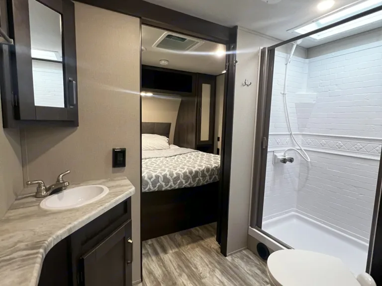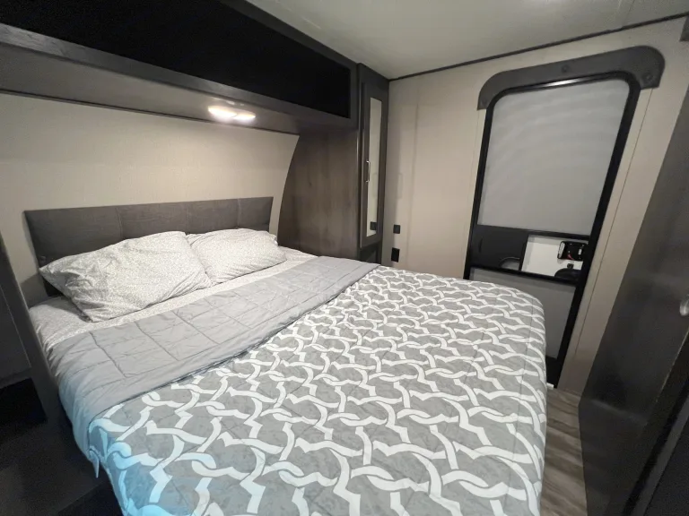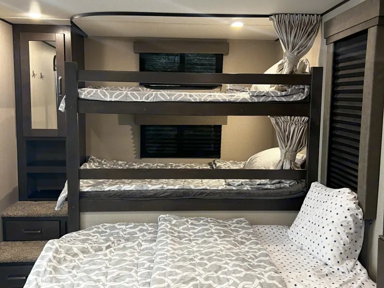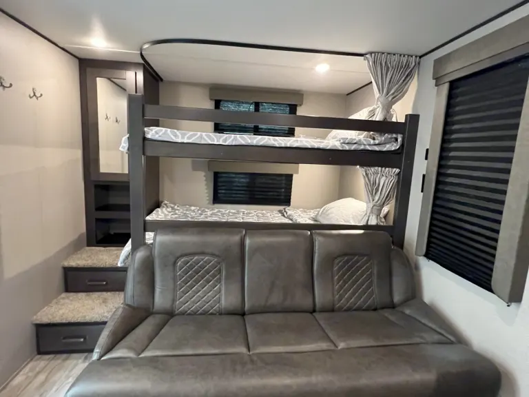 Bought brand new from the dealer, this Grand Design travel trailer sleeps up to 10 people with a queen master, two double/full bunk beds, and a sofa and dinette that each convert to sleep up to two people as well. Full kitchen with sink, microwave, fridge/freezer, stove, and oven! All the bathroom necessities with a sink, toilet, and shower.