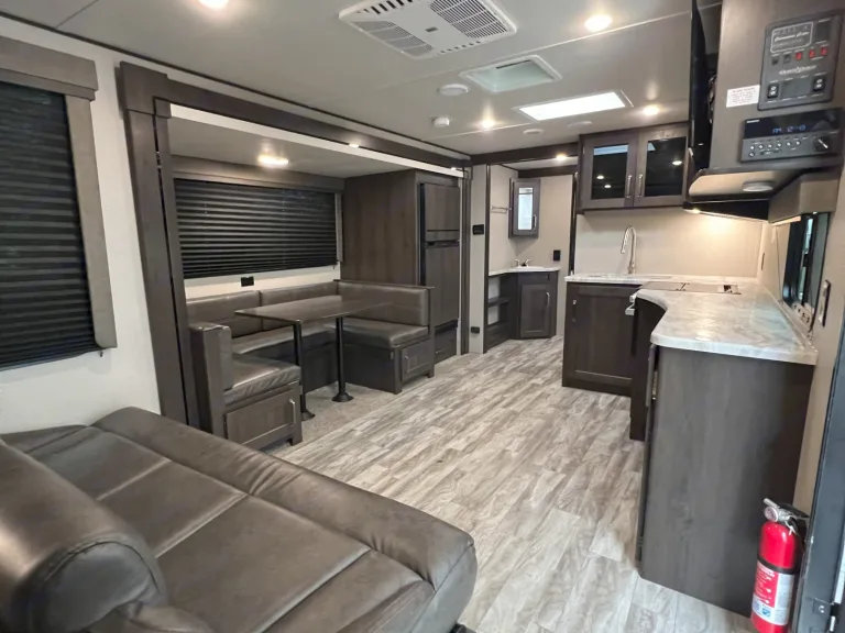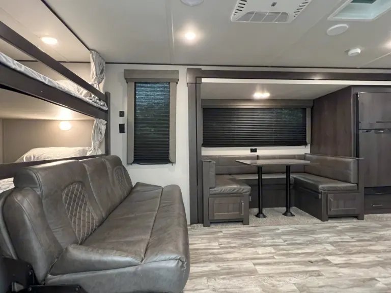 Bought brand new from the dealer, this Grand Design travel trailer sleeps up to 10 people with a queen master, two double/full bunk beds, and a sofa and dinette that each convert to sleep up to two people as well. Full kitchen with sink, microwave, fridge/freezer, stove, and oven! All the bathroom necessities with a sink, toilet, and shower.