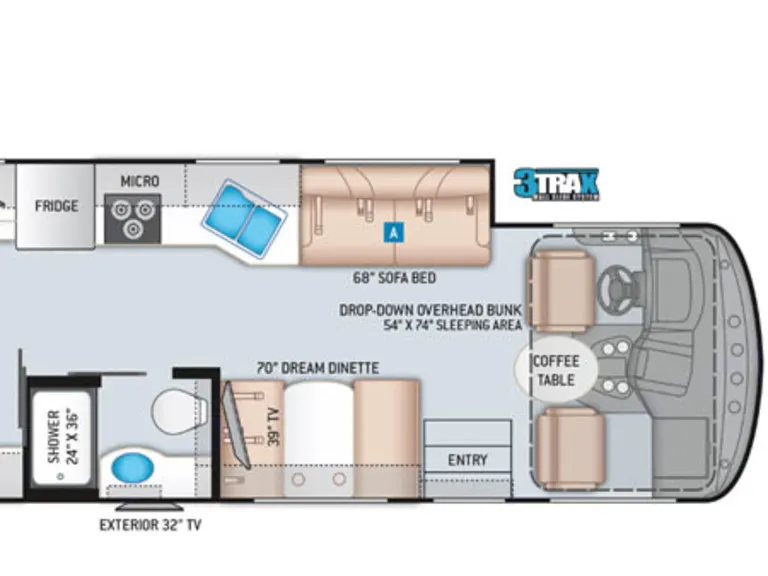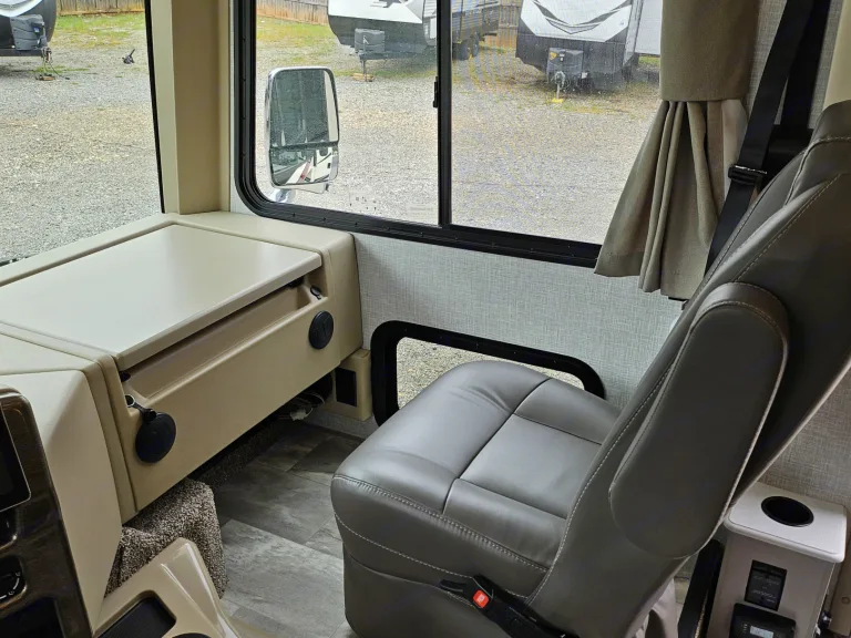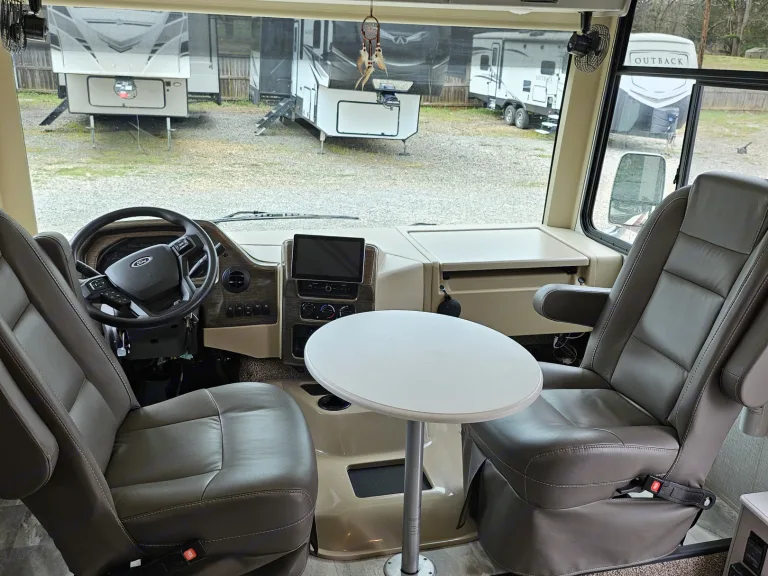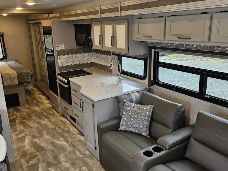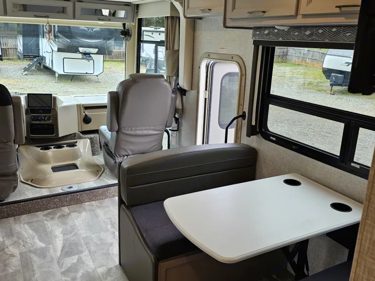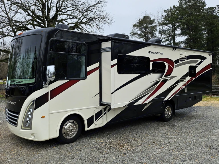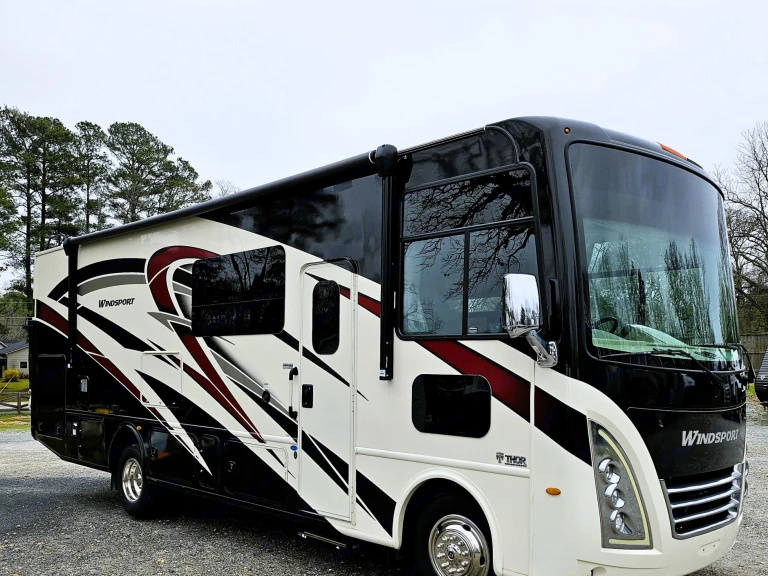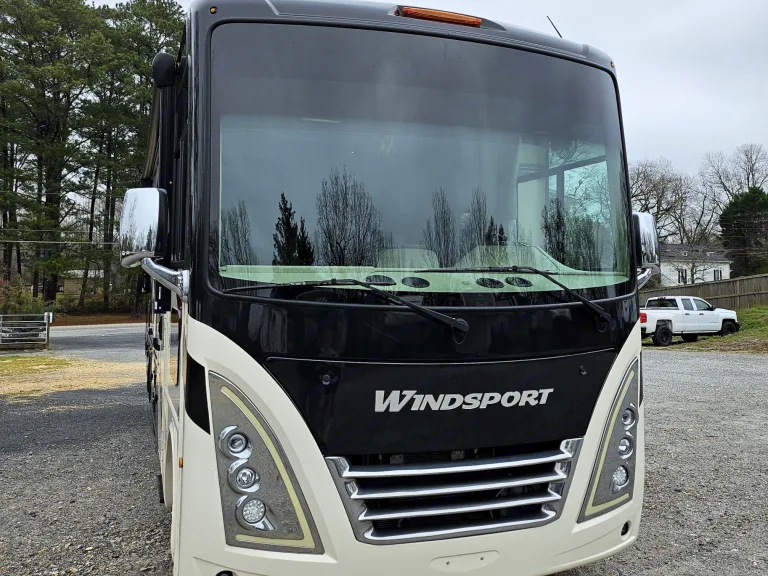 Have you been daydreaming about traveling the countryside with your spouse? Are you looking for additional sleeping space on occasion? This Windsport Class A gas motorhome will have you sitting by your number-one person in comfort and style. This unit features captain's chairs and a stow-away coffee table to enjoy your morning cup of joe, theater seating recliners, and a Dream Dinette all together providing enough seating for eight people to visit with one another. The Serta king bed in the rear bedroom allows you to sleep in comfort anywhere you decide to stay. The chef will appreciate all the kitchen amenities inside when making meals and outside when making dinner using the exterior kitchen. This unit also includes an exterior 32" TV, and if you prefer to watch television when inside, you will find a 39" TV in the living area and 32" TV in the bedroom!You will find there is much to love about the Thor Motor Coach Windsport Class A gas motorhomes, whether you are out for a long road trip across the country or a weekend reunion with family. All Windsport models feature Leatherette furniture, solid surface kitchen countertops, and flat panel upper cabinet doors with black nickel finish hardware and glass inserts on select doors. With the swivel and reclining captain's chairs featured in these coaches, you can easily bring them into the conversation area in the living space once parked. Each unit includes a dash workstation with 110-volt and 12-volt outlets at the passenger side for those who need to take work with them on the road or for those who just enjoy surfing the internet. On the outside, enjoy Rotocast storage compartments, a Pet-Link multiple-purpose tie down, and a legless lateral power awning with integrated LED lighting.