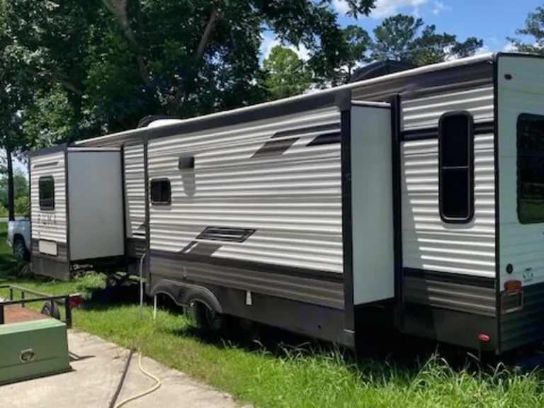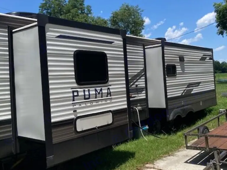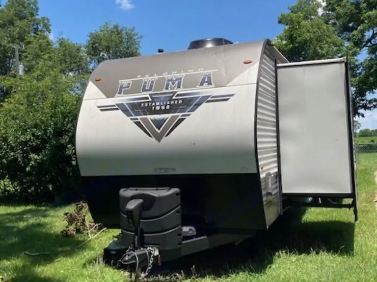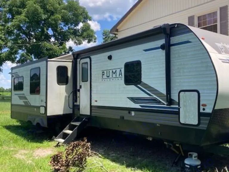 The 2023 Palomino Puma 31Rlqs is a spacious, well-appointed travel trailer designed for couples or small families who want residential comfort on the road. At just over 36 feet long with three slide-outs, it offers an open, home-like feel.Step inside, and the rear living area greets you with large panoramic windows, a theater seating set for two, and a tri-fold sleeper sofa for guests. The electric fireplace adds both warmth and ambiance, making cool evenings extra cozy.The center kitchen features a large island with deep stainless steel sink, abundant counter space, a residential-size refrigerator, three-burner range with oven, and a microwave. A generous pantry keeps food storage organized.The front private bedroom offers a comfortable queen bed, overhead storage, dual nightstands, and a full wall wardrobe with washer/dryer prep. The bathroom is roomy, with a 32”x40” walk-in shower complete with a seat and glass doors.Outside, a 13-foot electric awning with LED lighting extends your living space, while solar prep and backup camera prep keep you ready for modern camping needs. Built with an enclosed underbelly, durable rubber roof (12-year warranty), and marine-grade exterior speakers, the 31Rlqs is made for extended travel seasons.With its blend of residential touches, easy towing for its size, and thoughtful storage, the Puma 31Rlqs makes both weekend getaways and long-term adventures feel like home.