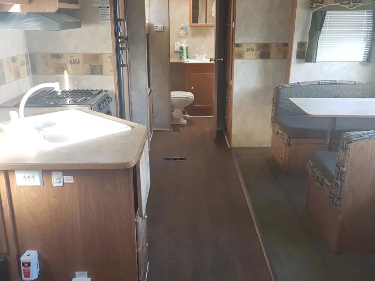 Sleeps 8 comfortably, queen bedroom in the front bunks in the back for the kids. Fold out couch and fold down table in the slide. bedding can be included if needed, camping chairs and wiener sticks can be included if needed .toilet chemicals and RV toilet paper will also be included and is mandatory to be used if using the toilet. Cutlery,dishes, toaster included,