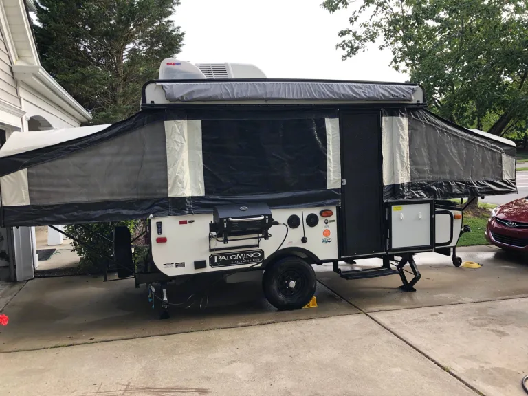 This 4 years young, non smoking pop-up is perfect for the new or experienced camper! With air conditioning and a heater, it's perfect for those unpredictable North Carolina nights. Comes fully equipped with a gas grill, Keurig single serve coffee maker, utensils, electric pot, and pans. Has a radio inside and outside with blue tooth capability. A queen and a full size bed at the ends, and a table that folds into another bed is perfect for your family and friends camping needs. At under 2000 lbs this camper is light-weight, and can be pulled with most SUV's and mini-vans.