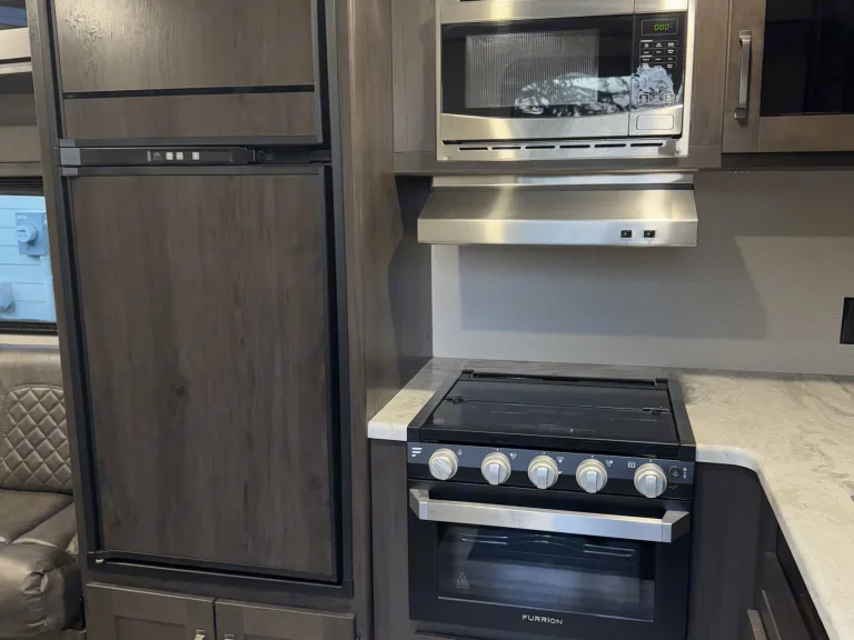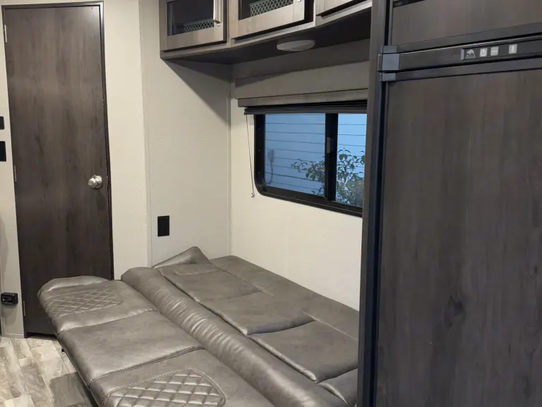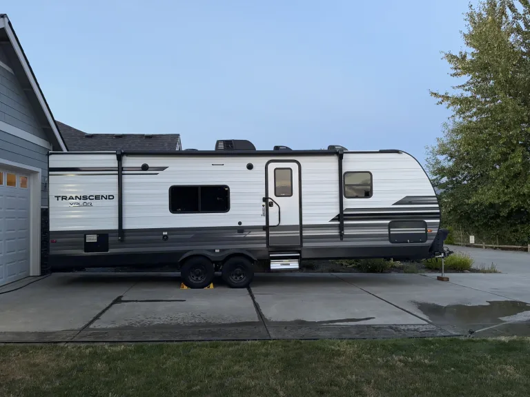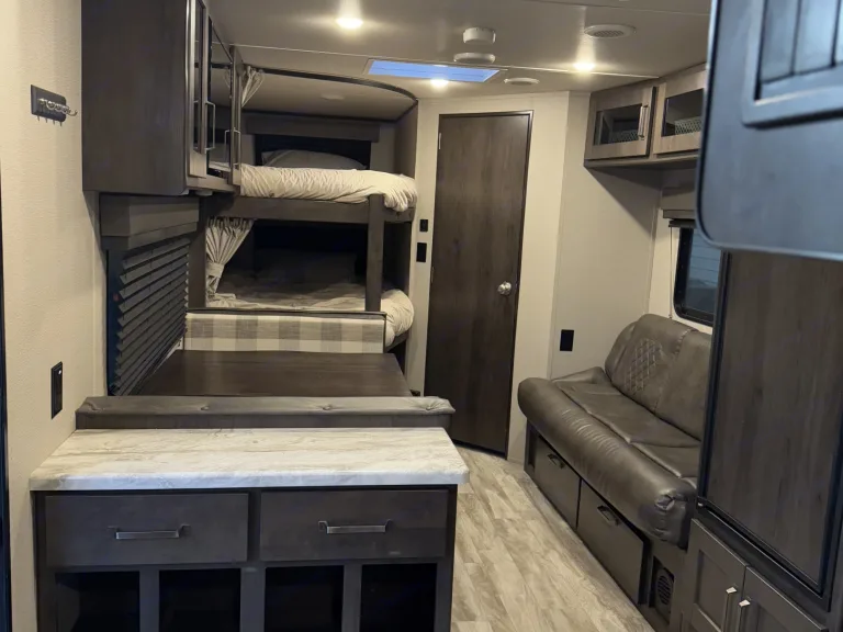 Make our travel trailer your home away from home. The trailer features no slides for easy parking and easy access.Sleeping: Features a queen size bed, 2 double bunkbeds, a fold down couch and a dinette conversion. It can comfortably fit a family of 7-8 or 5-6 adults.Kitchen Amenities: Enjoy the convenience of a fully equipped kitchen including a microwave, fridge/freezer, small coffee makers, stove top and oven, large kitchen sink and array of kitchen tools.Bathroom Amenities: Equipped with sink, shower and toilet. Trailer is stocked with bath and hand towels, hand soap and there is storage space next to the shower.What's included• Two propane barrels