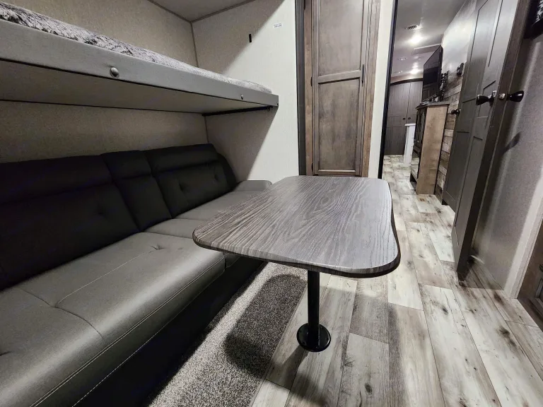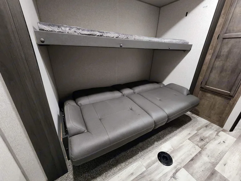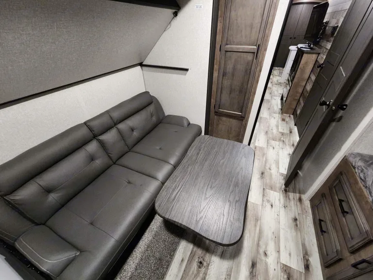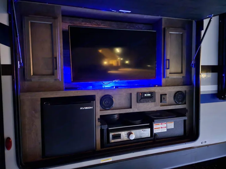 Indoor and outdoor kitchen, LED lighting inside and outside, outdoor TV/Entertainment center with Hdmi hookups and DVD players. Theatre chairs with heat and massage. Separate back room with private door for the kiddos or guests and queen private suite up front. Two exterior doors allows easy access to bathroom without having to walk through the main living areas.