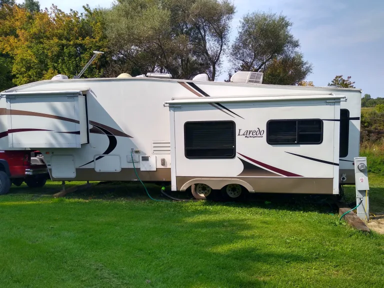 Comfortable Layout is a good way to describe the Laredo! This Unit comes with everything needed to operate. Upgrades that come with the trailer are listed here: 50" UHD TV, Outside Awning lighting, All purpose grilling tray, oven sheets/pans/pots, Juice/Tea Dispenser, Fry Daddy, Memory Foam mattress, Coffee Table, Trash Can, Kitchen Knife Set, Hotel Quality Bedding Set. All these items can save you money and make your stay more comfortable...I have not used the satellite or the sound system, it is there though. The Samsung TV renders the sound system unnecessary, and with a good wi-fi connection, the TV also makes satellite unnecessary, with all the apps. ***Another plus about this unit is the corner electric fireplace. At night with the bedroom door shut, that heater will help keep the main room warmer much easier, this also keeps the main heater from kicking on so much.