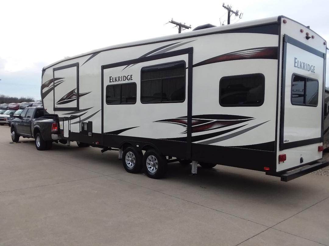 Beautiful, brand new 35 foot Elkridge fifth wheel with 4 slide outs. Front bedroom with a rear salon with a couch/hide-a-way bed and a bunk. Two living areas, fireplace, 2 A/Cs, Kitchen Island, stainless steel residential refrigerator, pantry, king size bed, 6 point auto leveler, Electric Awning, 50 Amp Service. Trailer does not have an on board generator, but a portable one is available at an additional cost. If you do not elect to rent our generator, you will need to hook up to a power supply to run the A/C, TVs, Refrigerator, and Microwave.